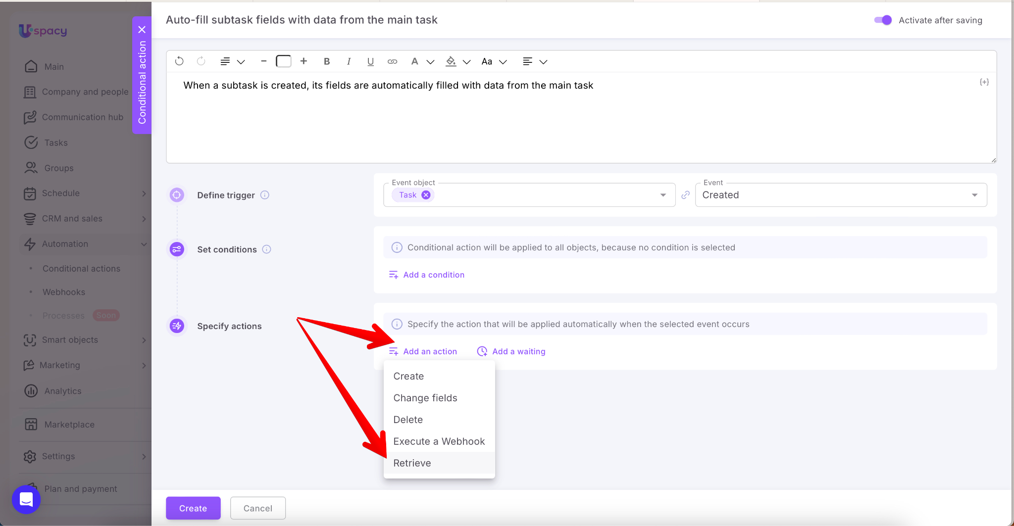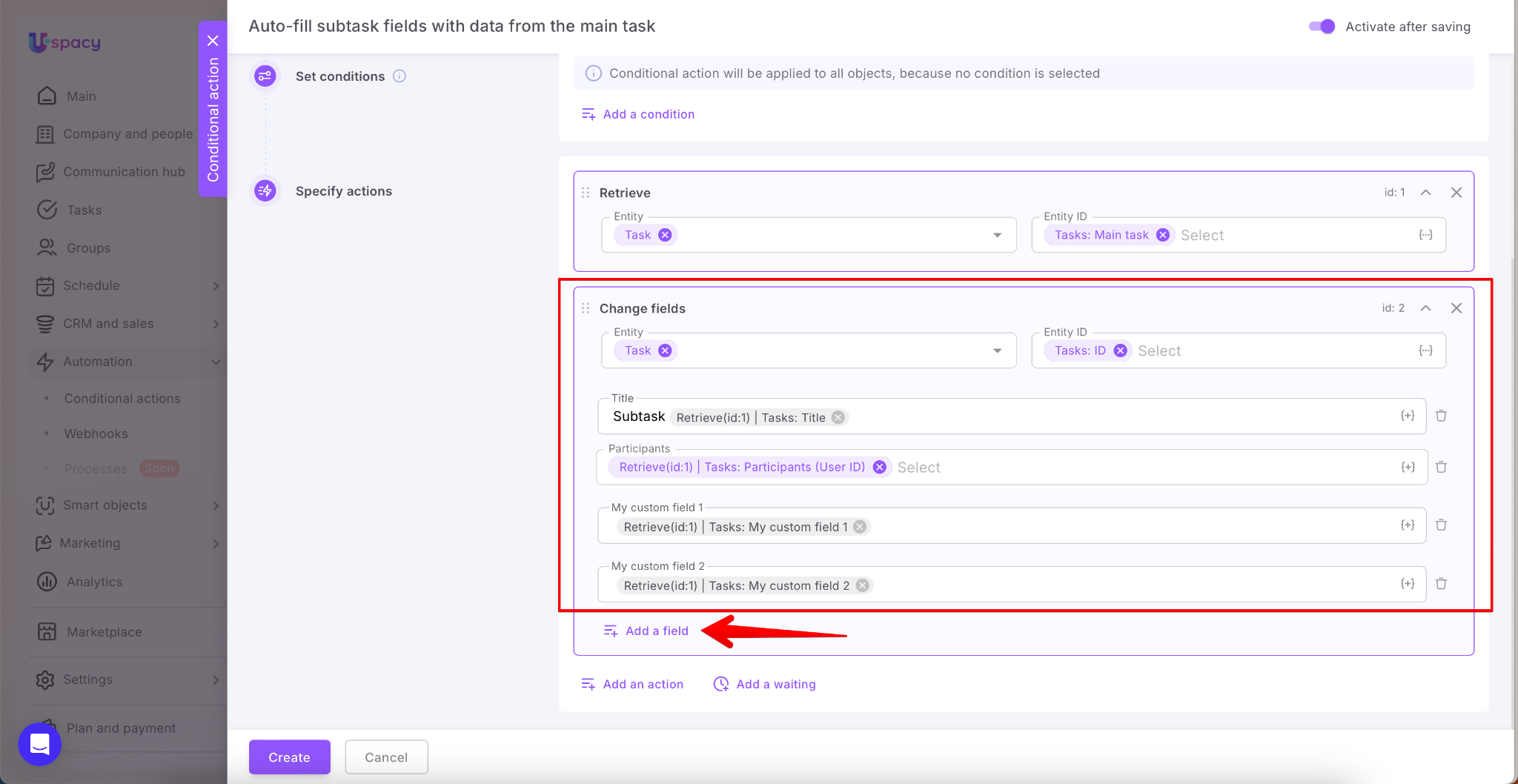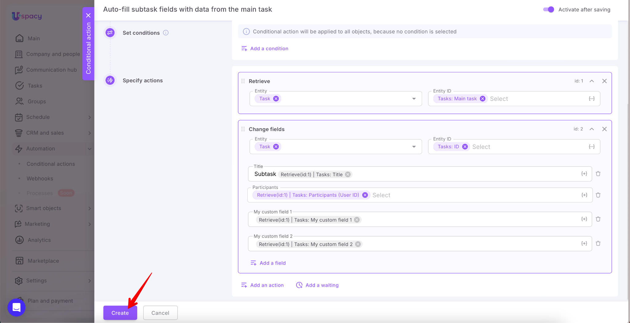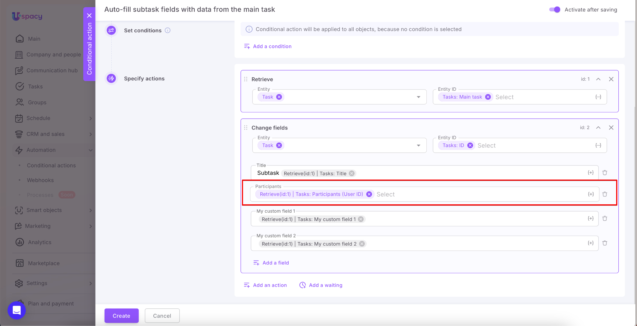 To avoid this, you can set up a Conditional action: when a subtask is created, the system first pulls data from the main task using the Retrieve action, and then uses the Change fields action to populate the newly created subtask with values from the main one. This works for both default and custom fields and allows you to transfer participants and necessary links (CRM, Smart Objects, etc.)—all without extra user steps.