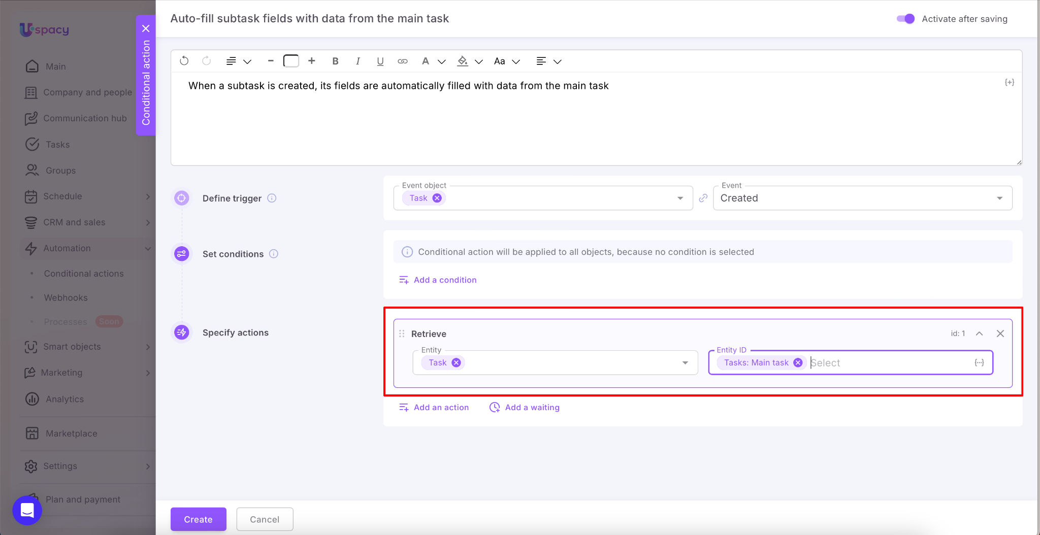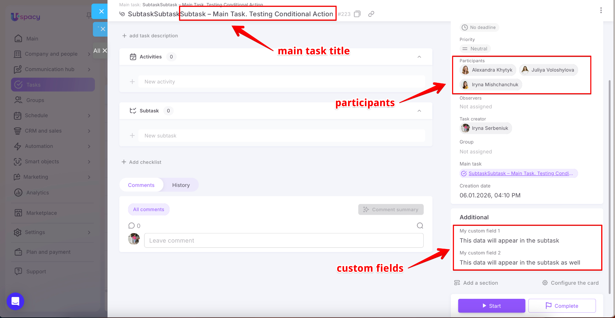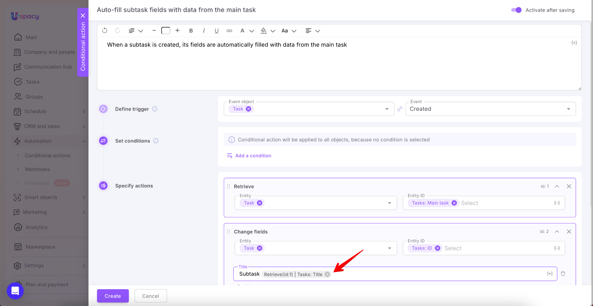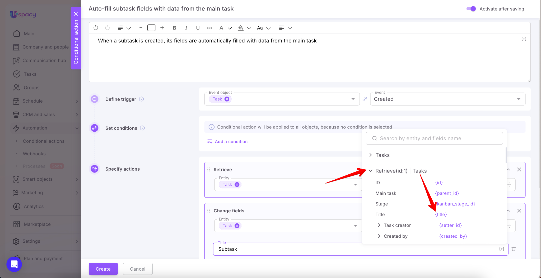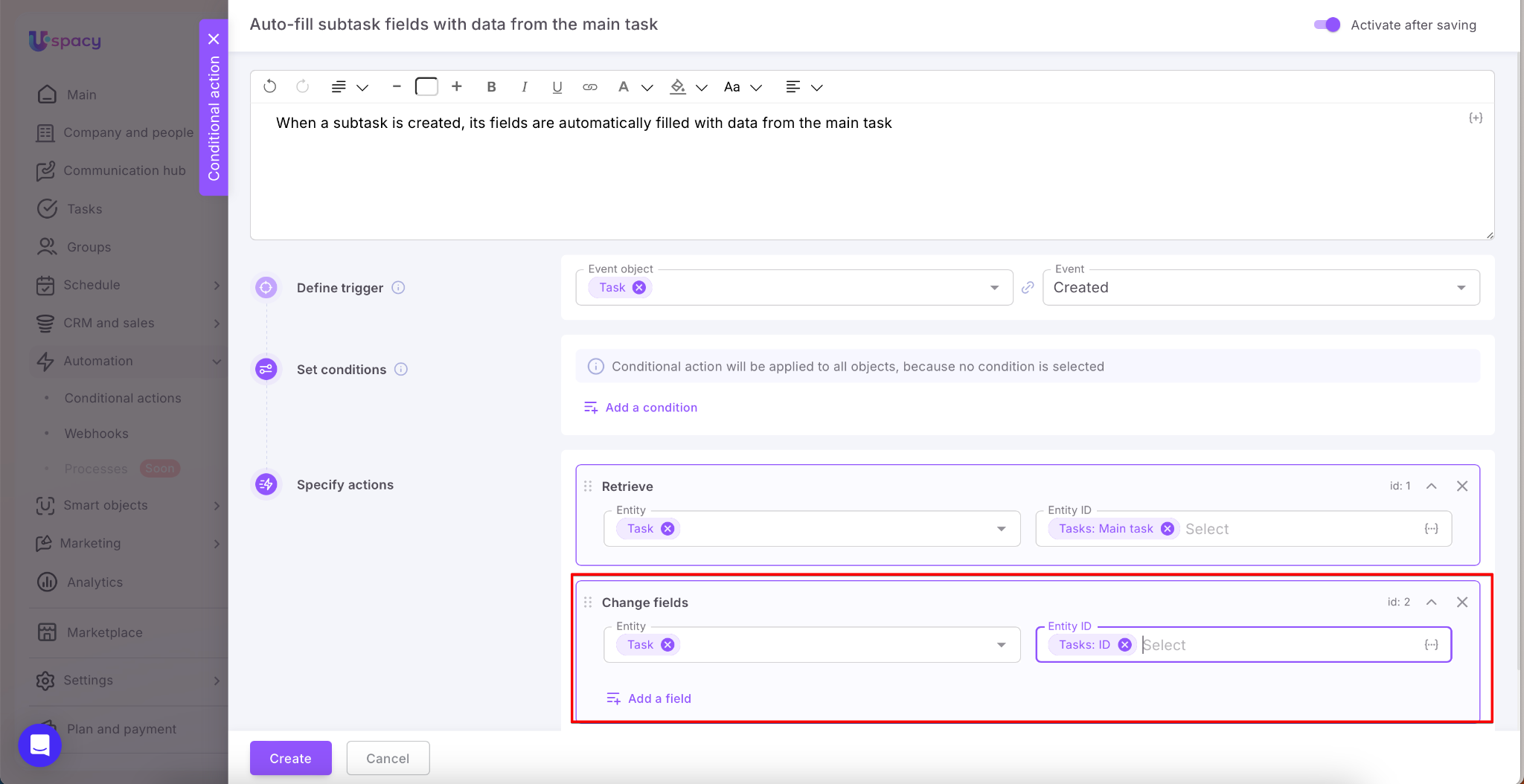 To avoid this, you can set up a Conditional action: when a subtask is created, the system first pulls data from the main task using the Retrieve action, and then uses the Change fields action to populate the newly created subtask with values from the main one. This works for both default and custom fields and allows you to transfer participants and necessary links (CRM, Smart Objects, etc.)—all without extra user steps.