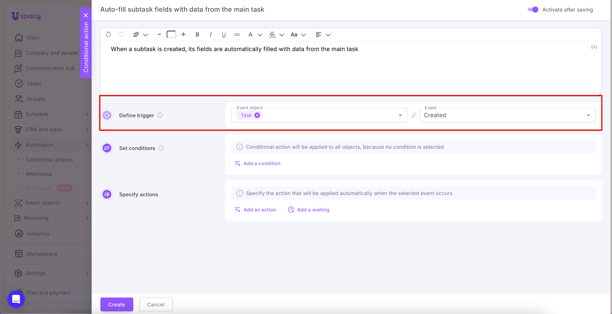 Define the trigger. In our example, the trigger is creating a new task.