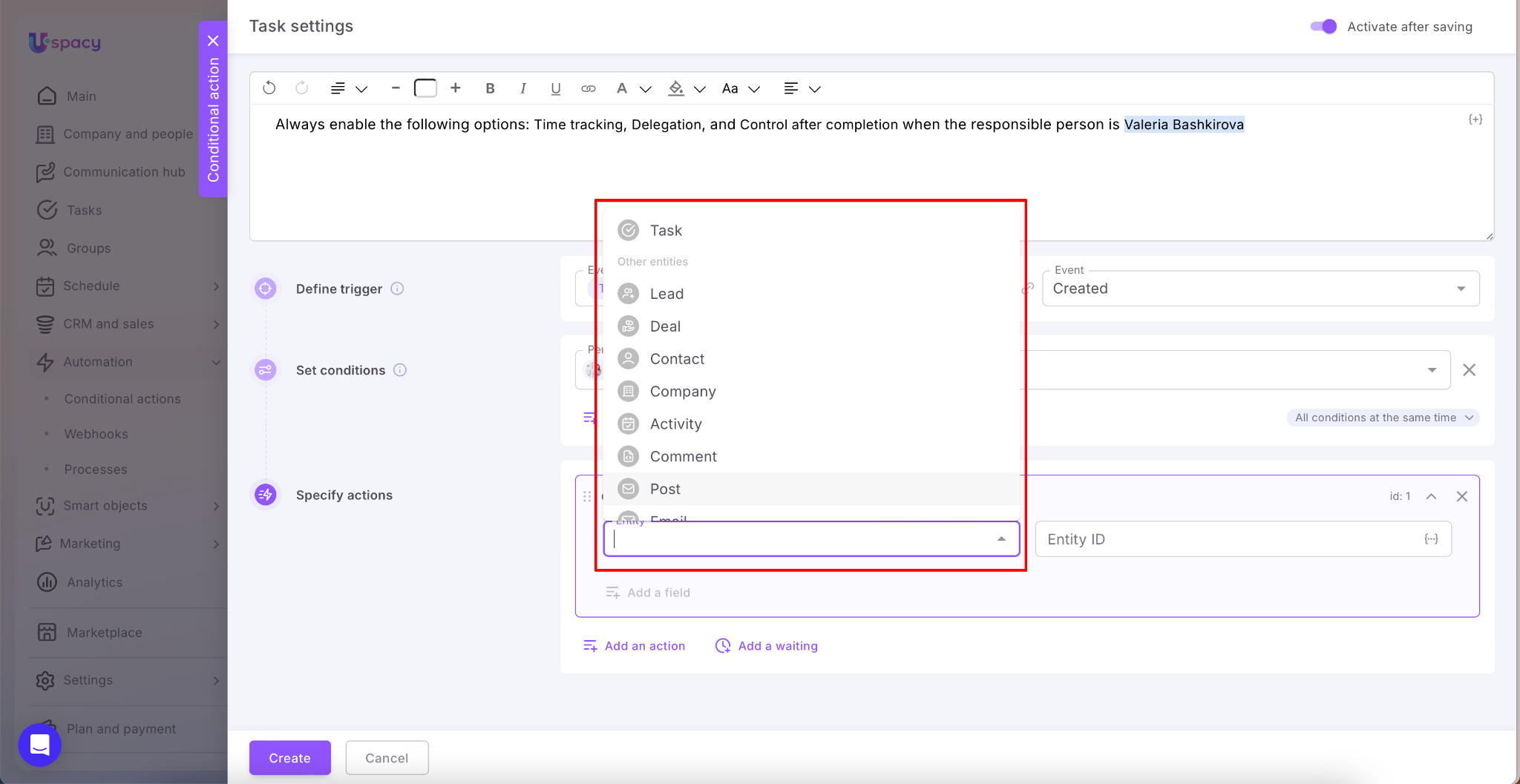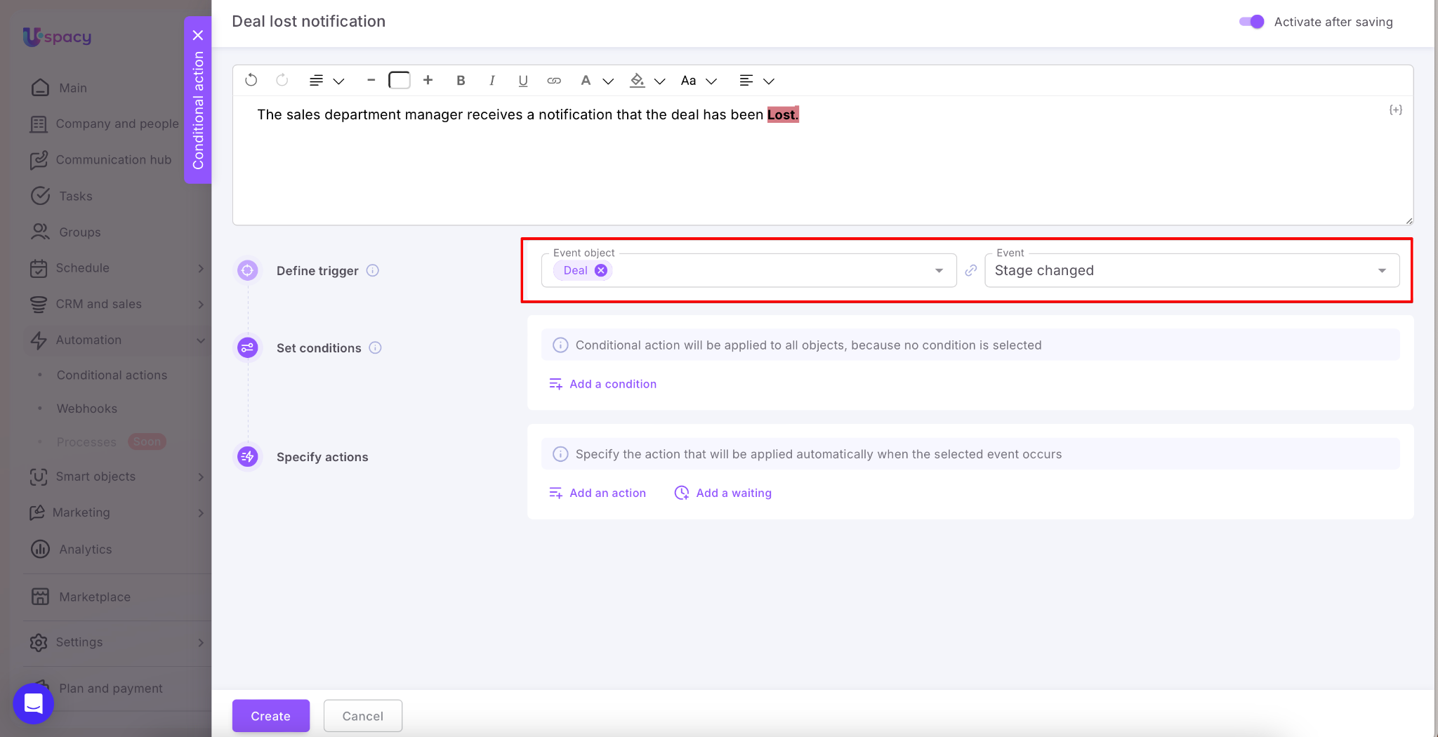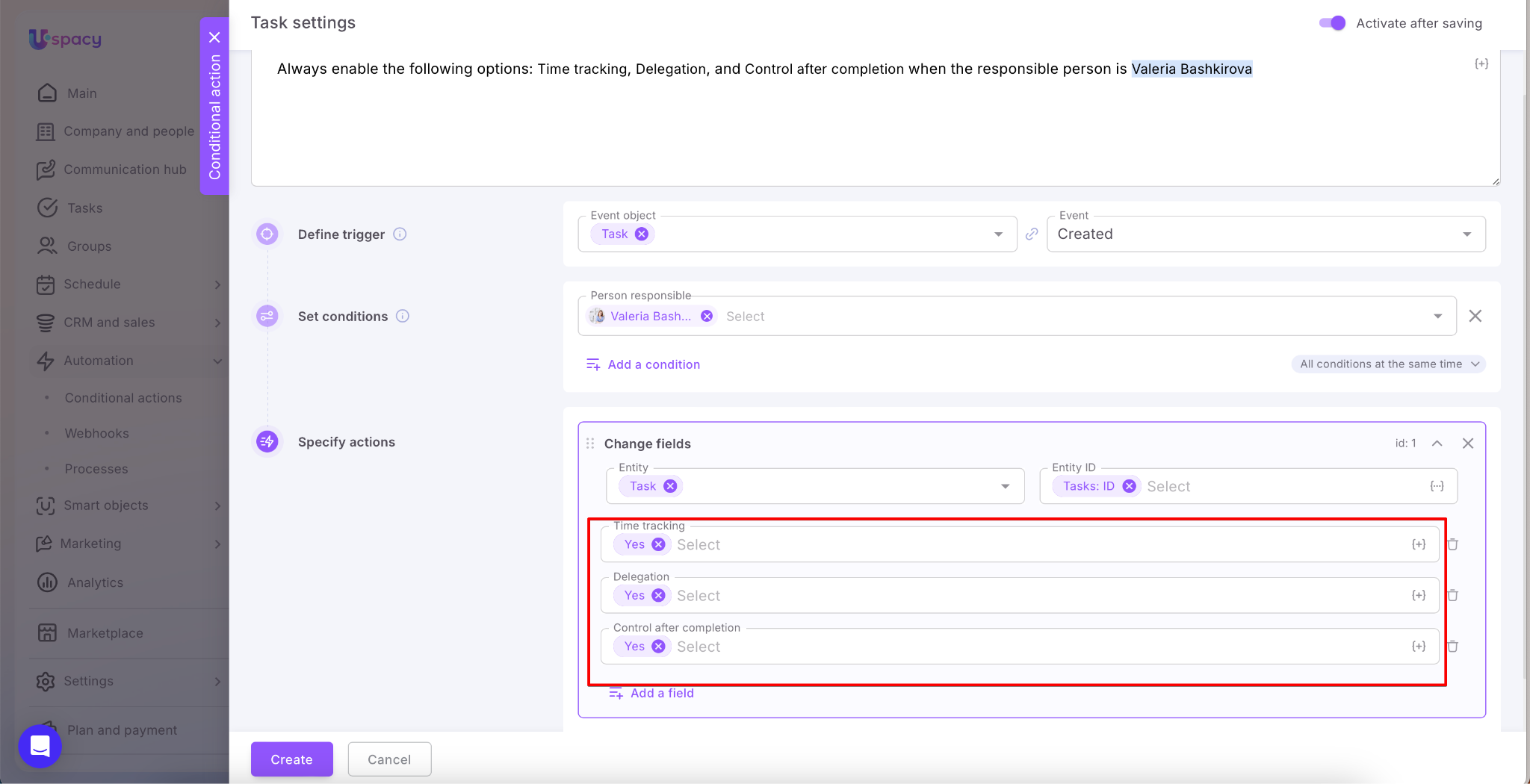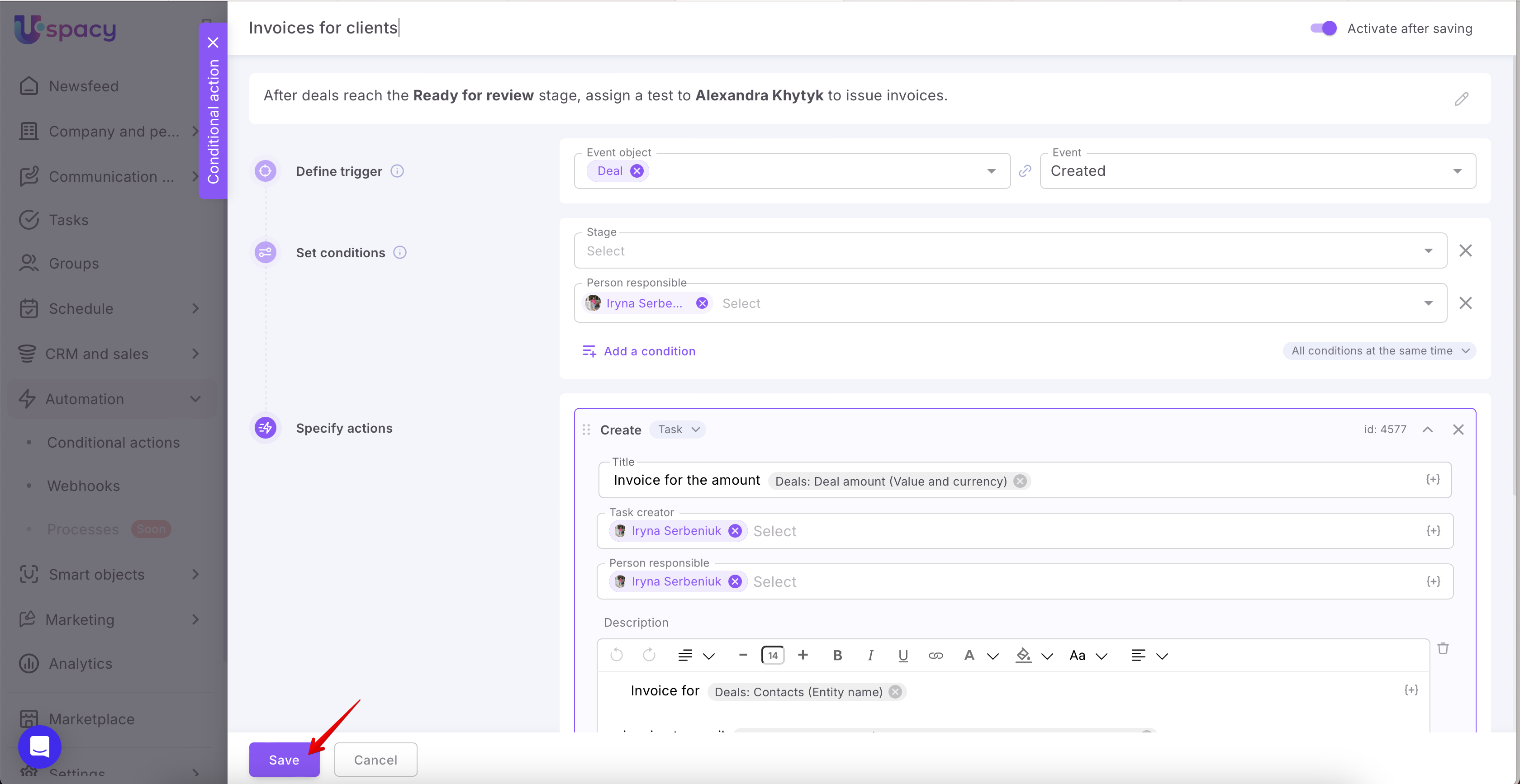 When all the settings (the trigger, conditions and actions) are set, it remains only to save and create a conditional action.
