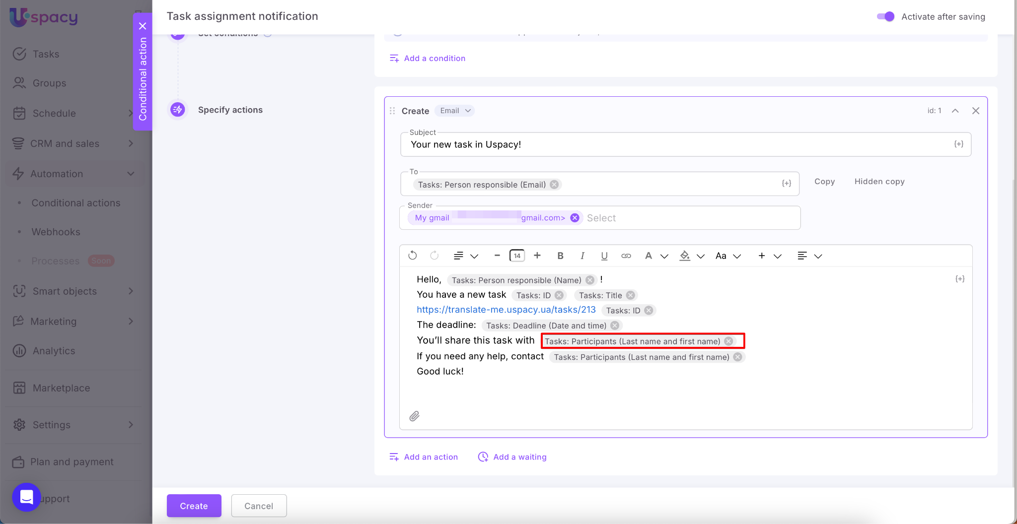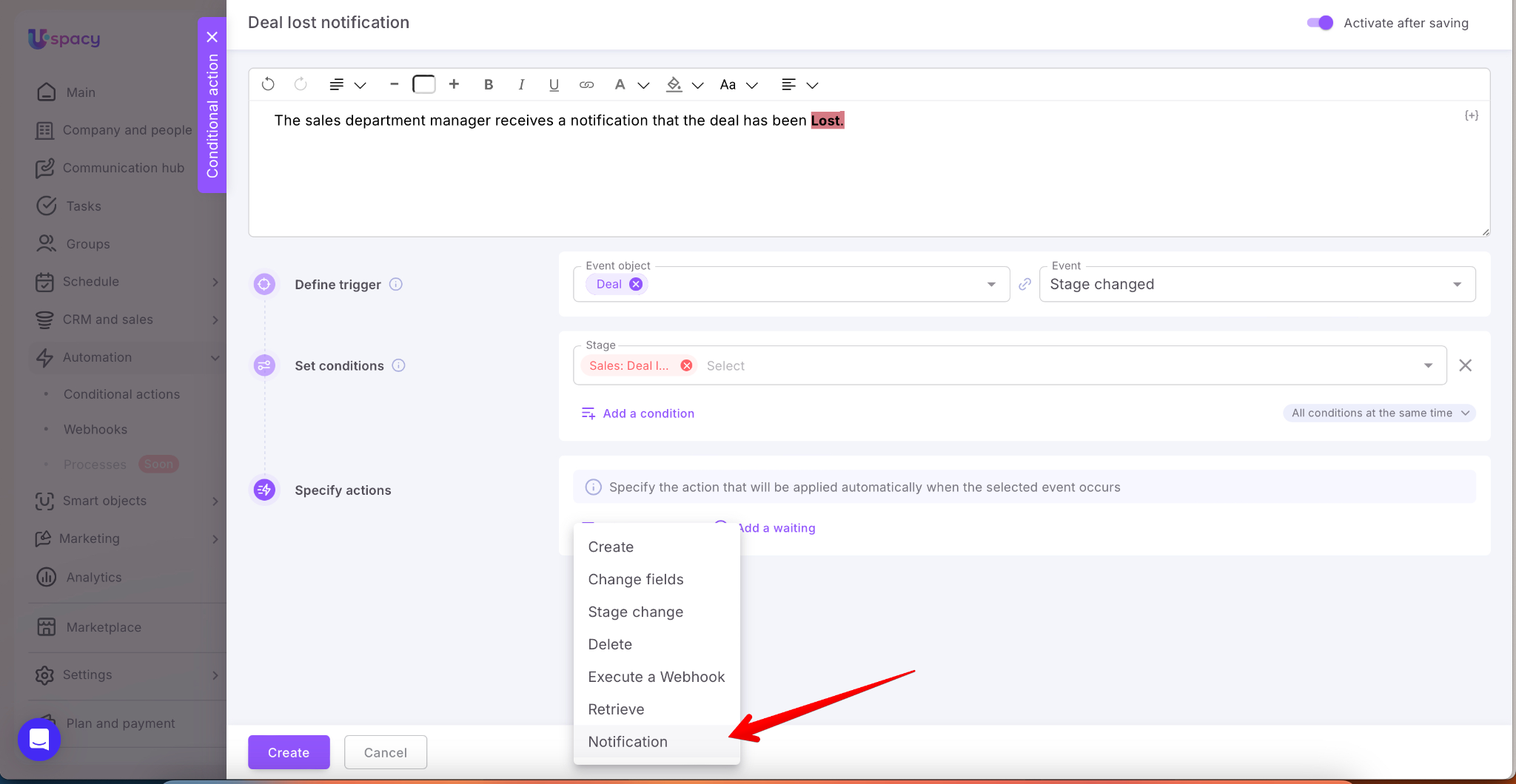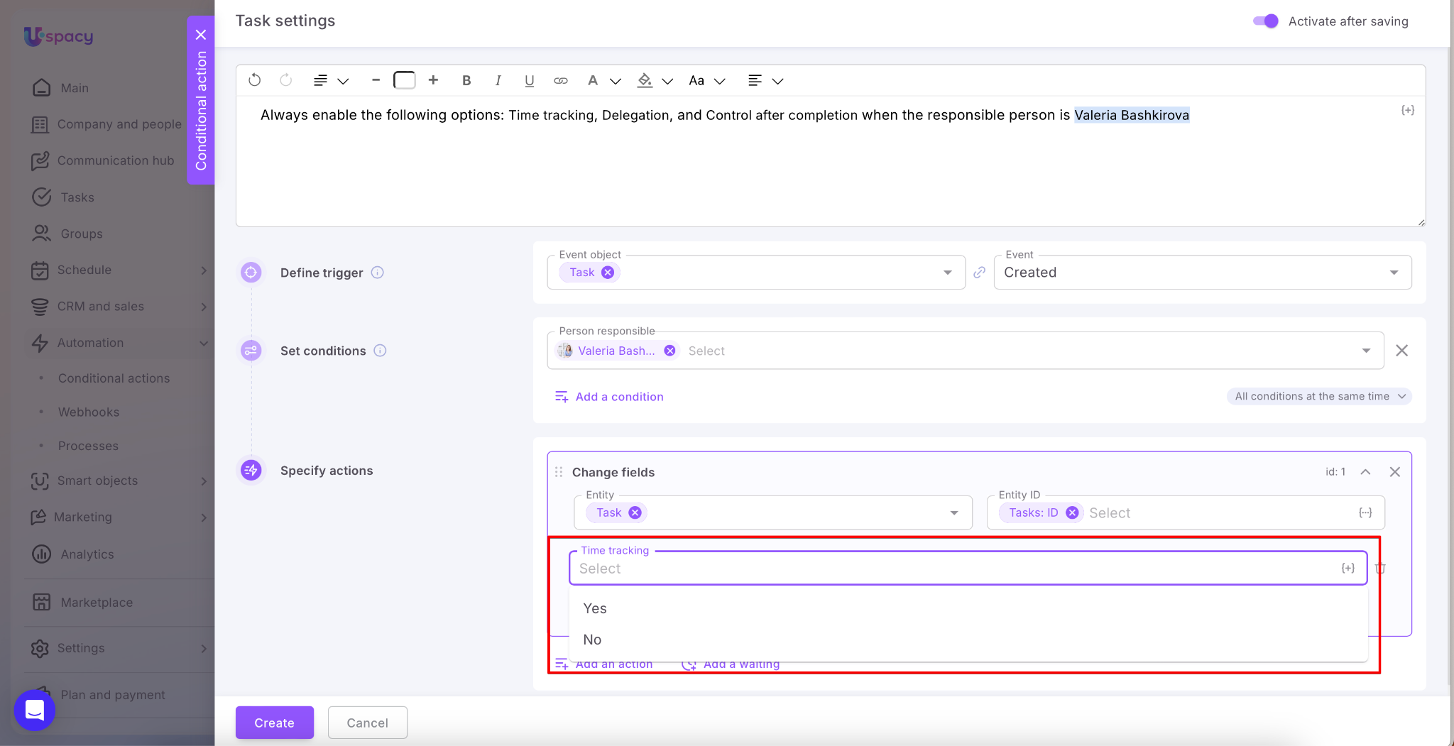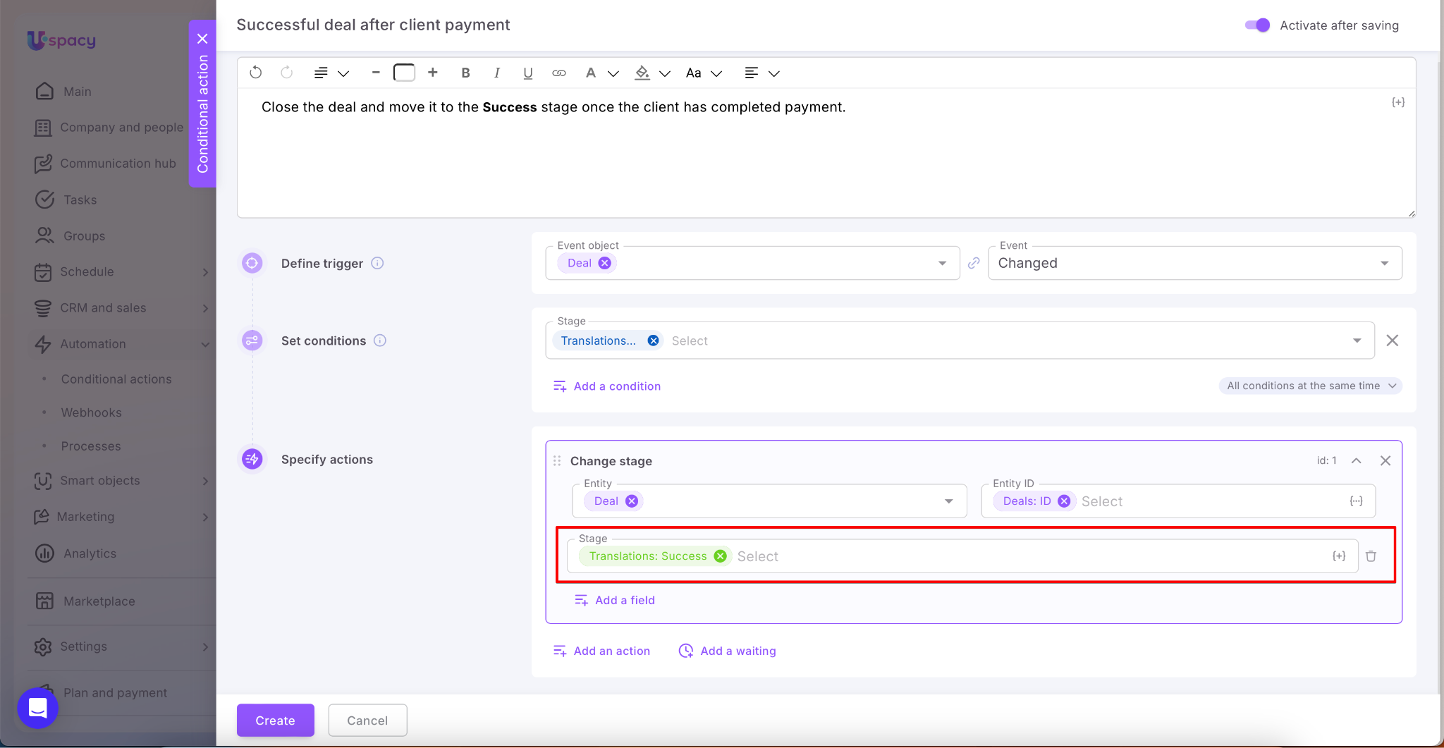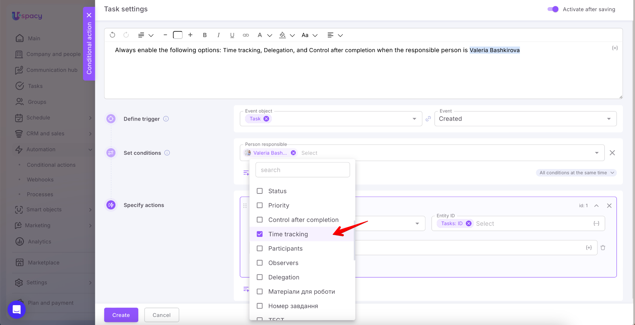 When all the settings (the trigger, conditions and actions) are set, it remains only to save and create a conditional action.