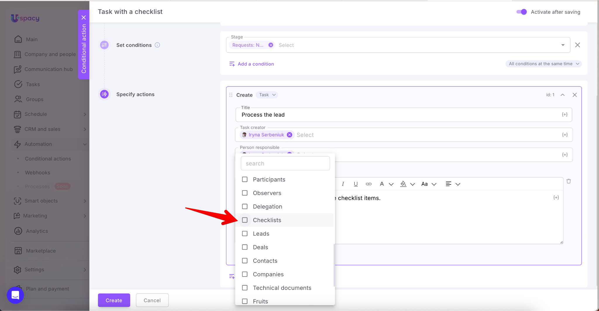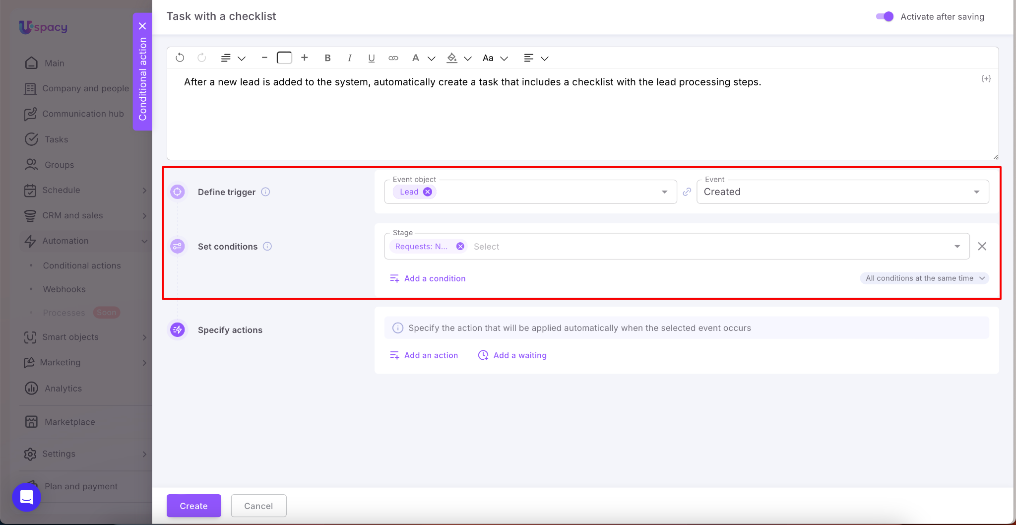 To set up a conditional action for automatically creating a task with a checklist, start by defining the trigger and setting the conditions, as usual.