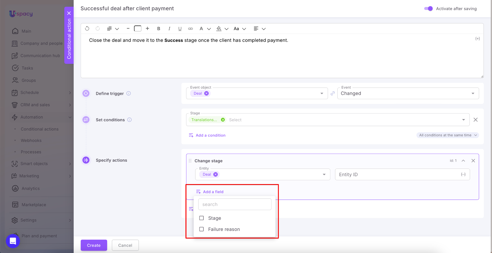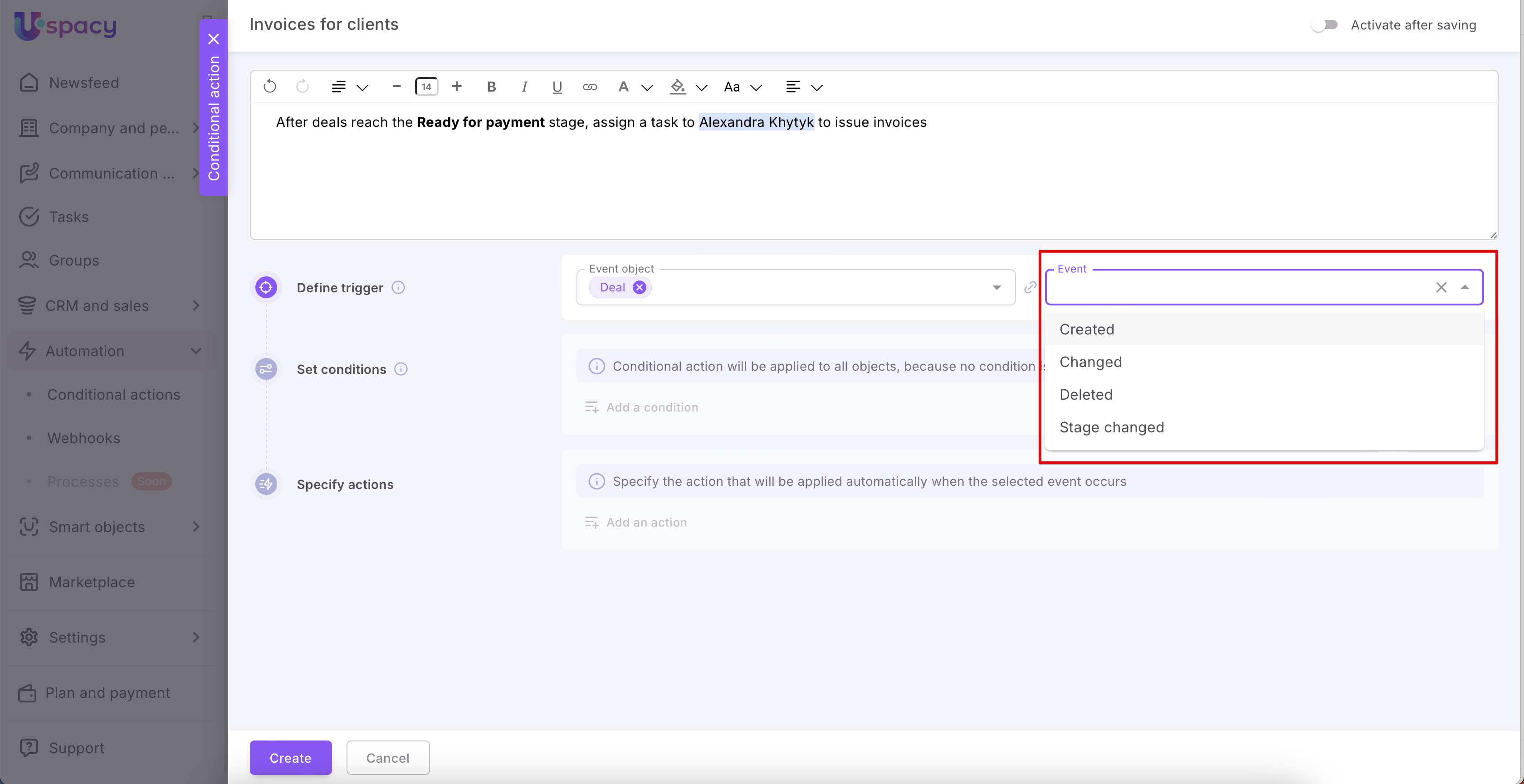 ❗️If the trigger should be a stage change in a lead or a deal, then you need to select Stage changed as the event. If you specify Changed, then the configured conditional action will not work as a result.