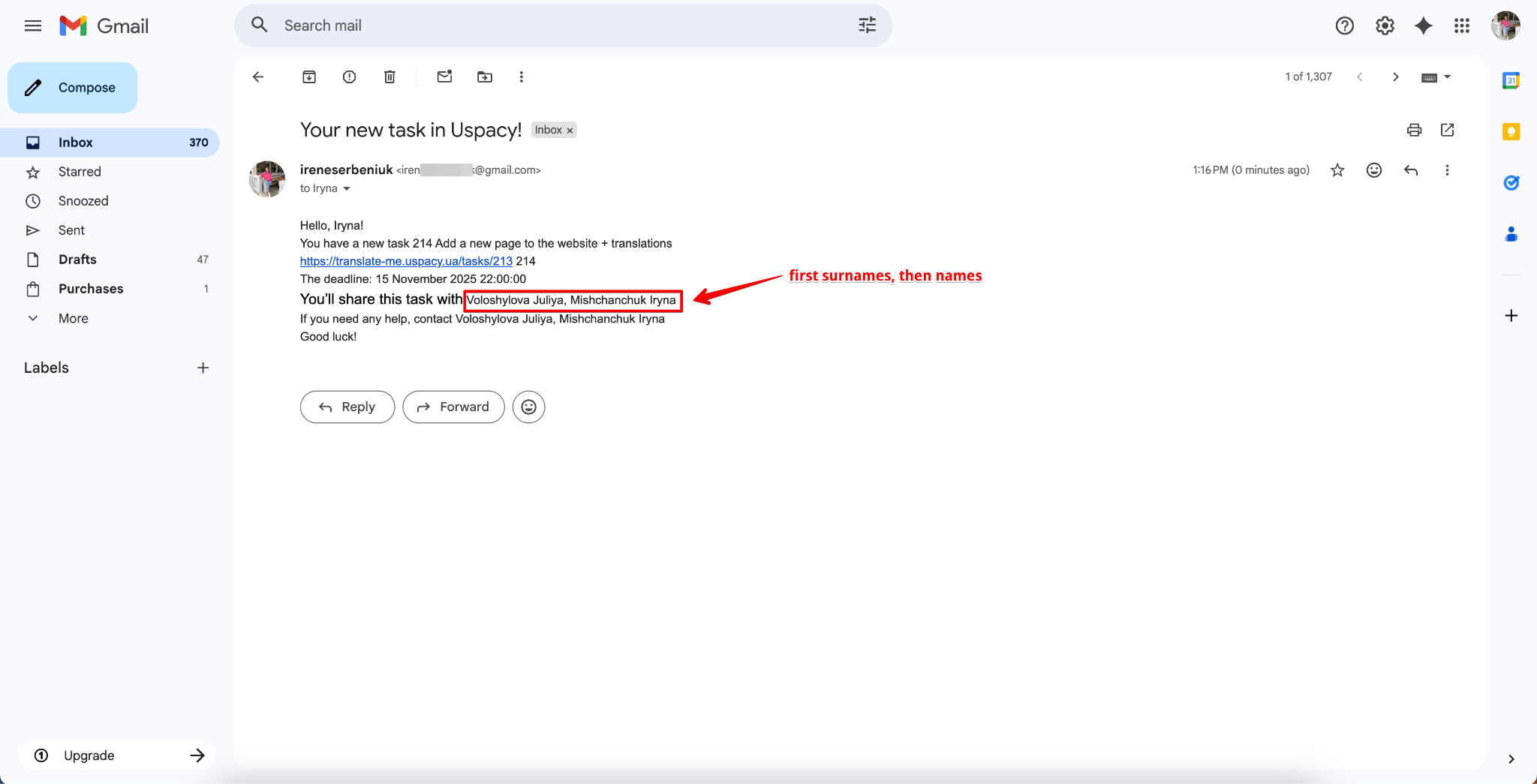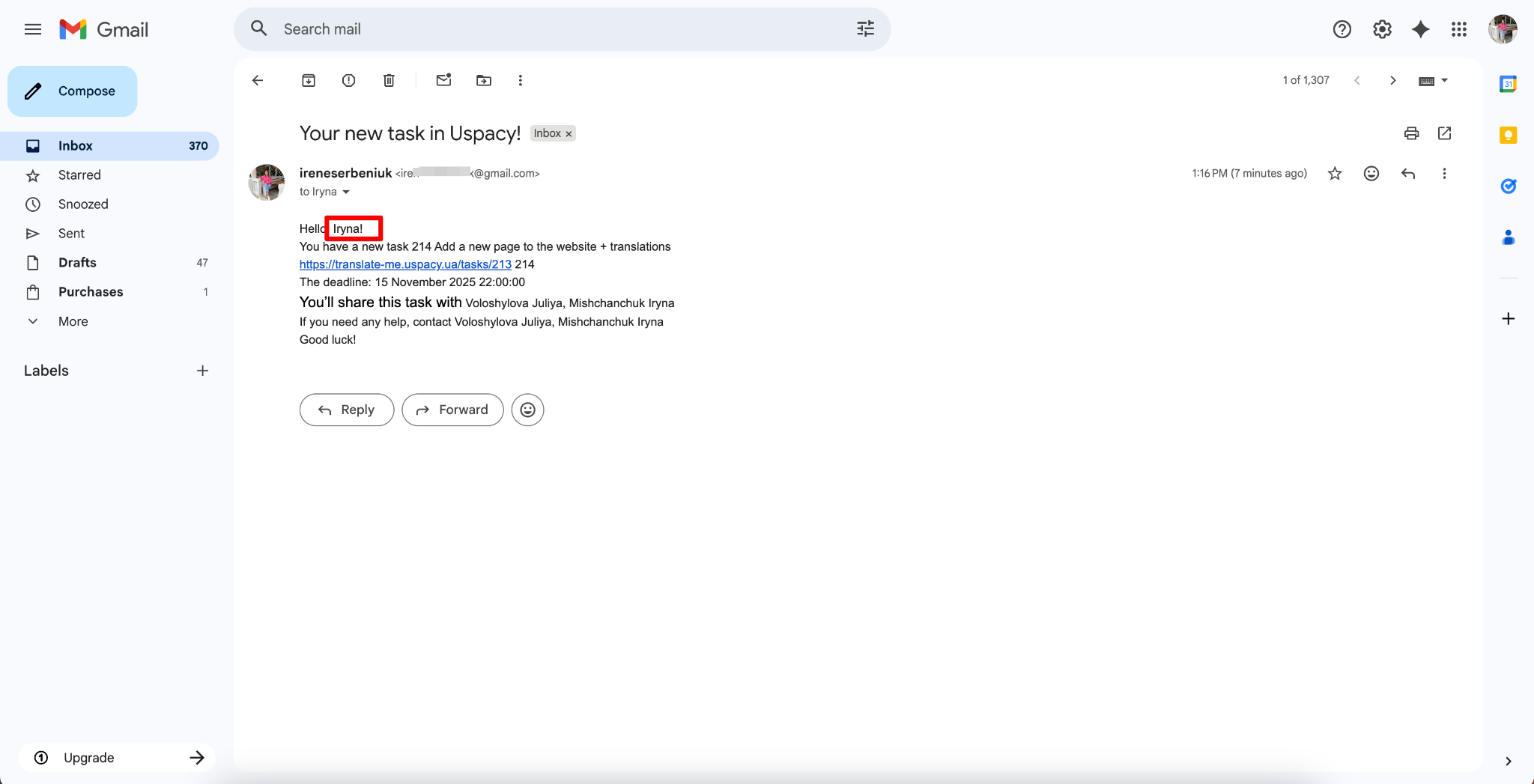 - To address the person informally by first name: “Hi, Task:Person responsible (First name)!”