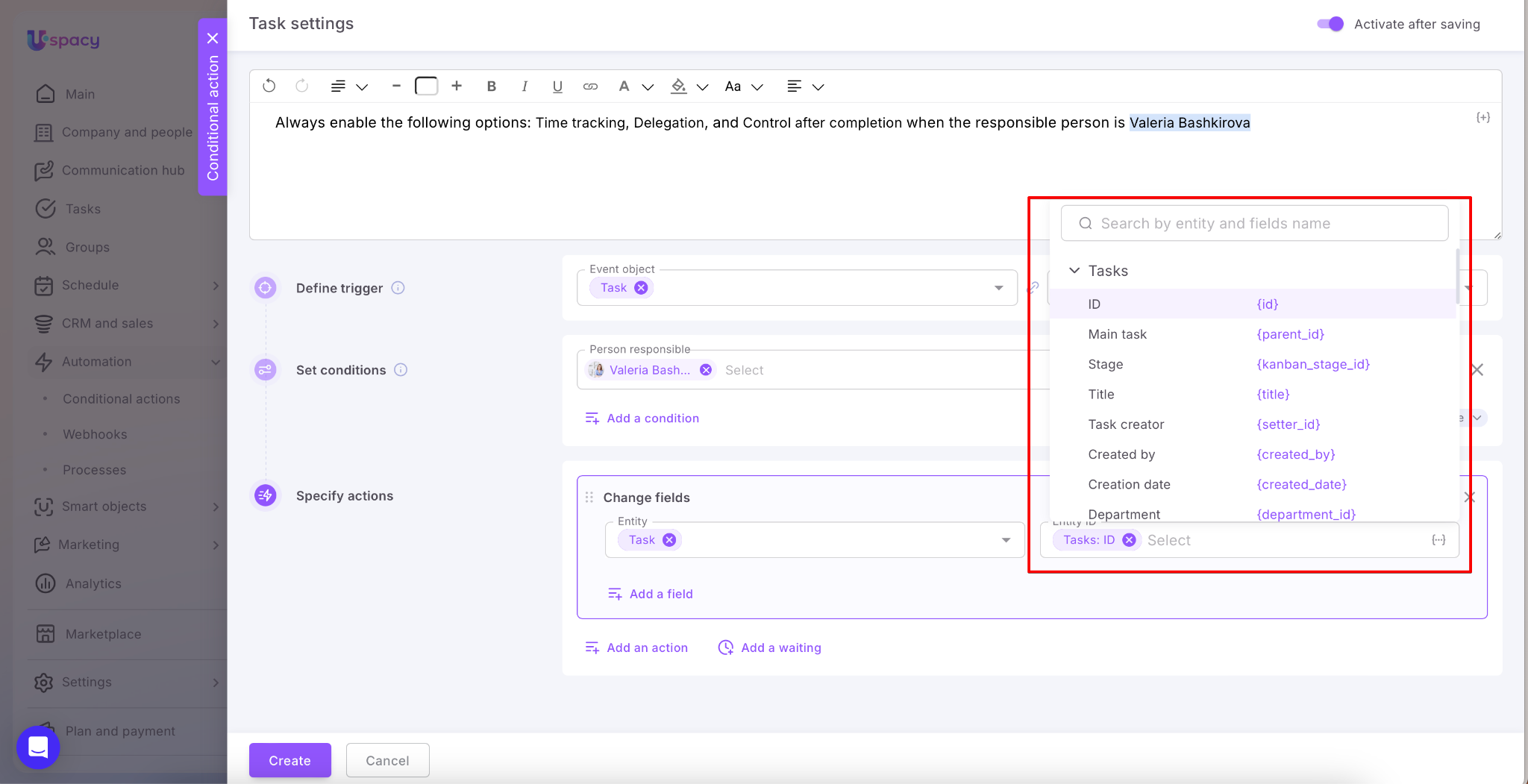 Conditional actions in Uspacy are one of the ways to automate work in Space. Namely, to configure automatic performance of certain actions in entities and tools based on conditions defined by the user.