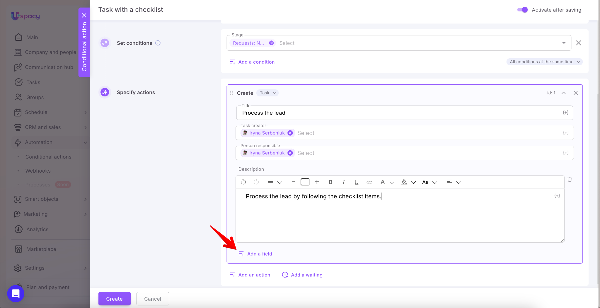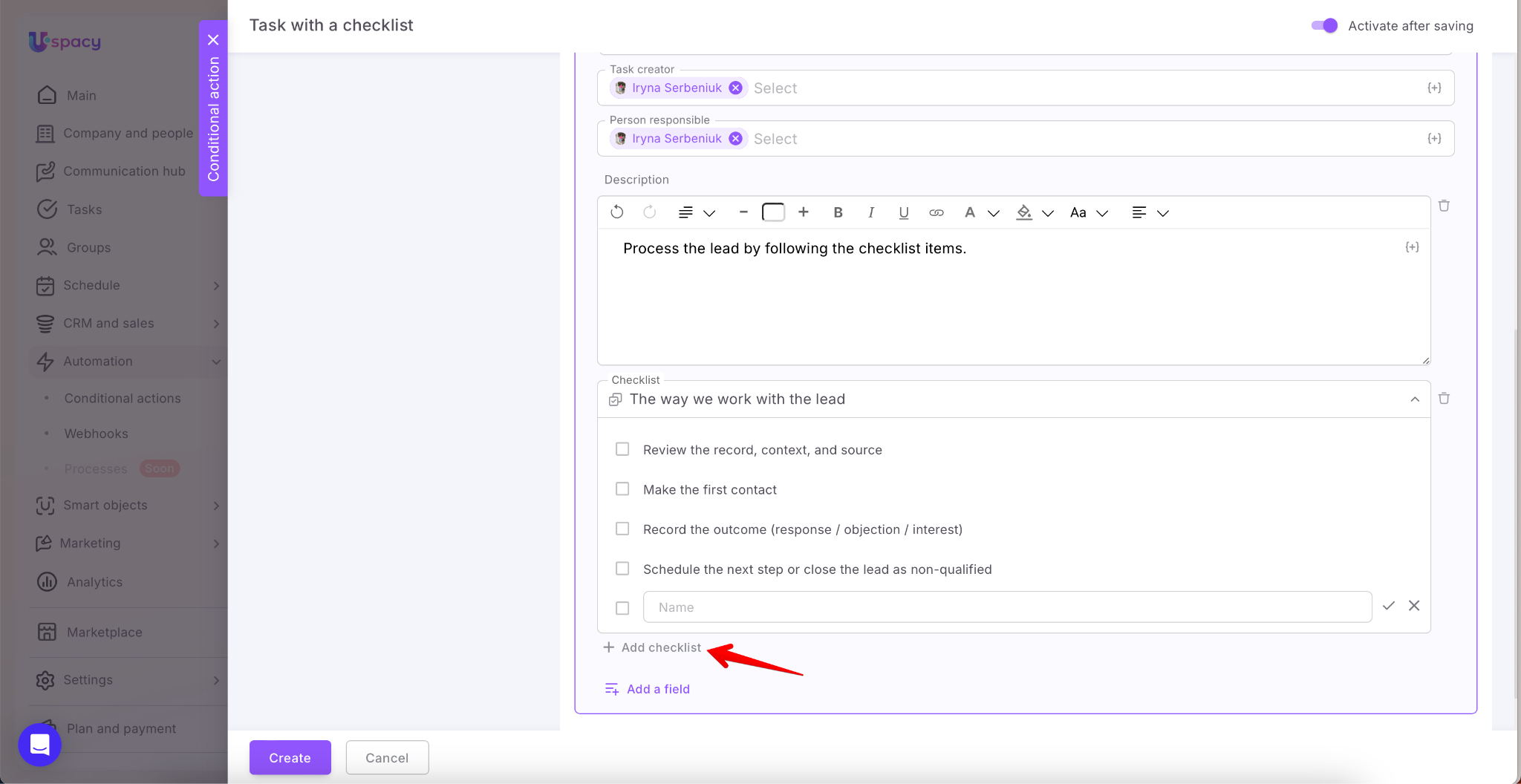 When you combine this with Conditional actions, tasks can be created automatically—only when a specific event occurs and the defined conditions are met (for example, when a new item is added or when a stage, status, or another field changes). As a result, the team gets a controlled process: tasks with a clearly structured checklist that guides the next steps and reduces the risk of missing important details. This helps keep processes organized and eliminates the need to manually repeat the same actions every time.