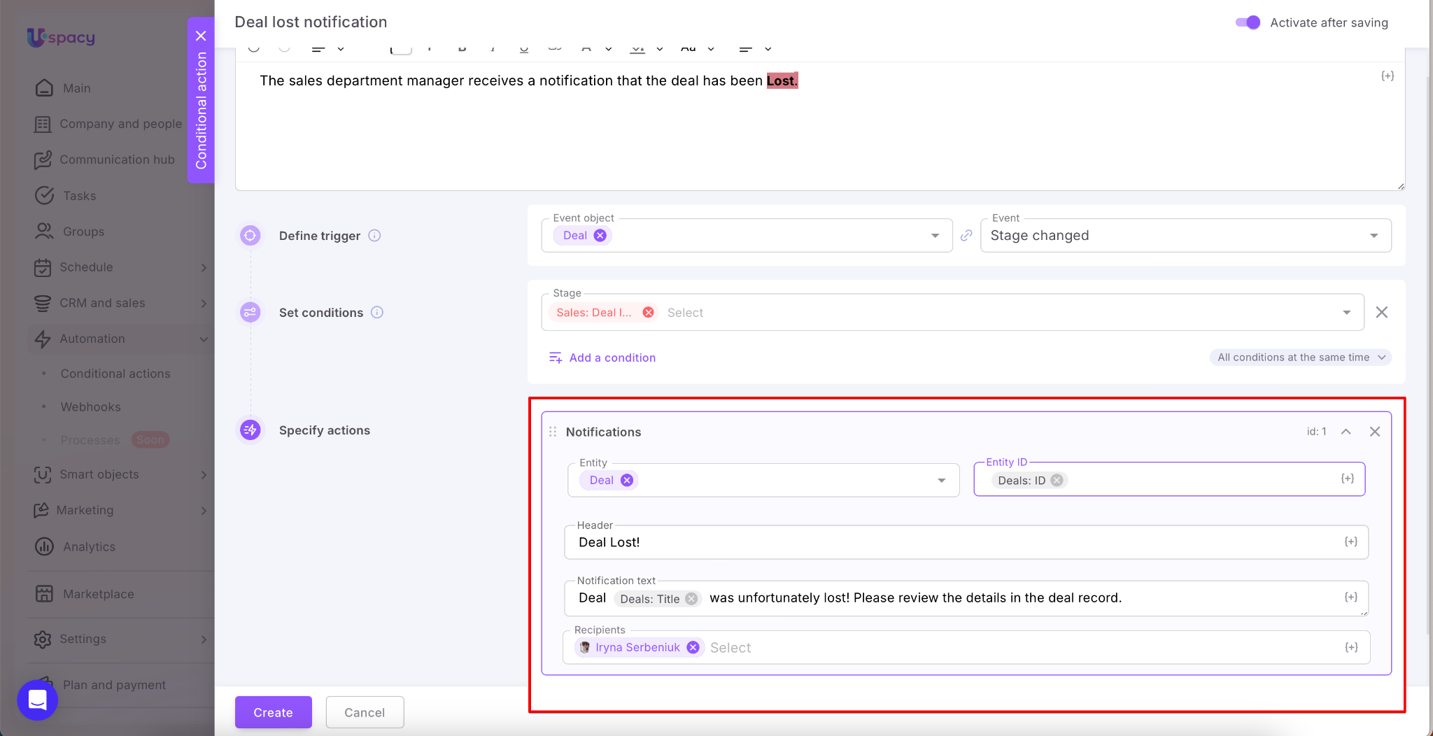 For example, you can alert the sales department manager when a lead or deal is lost.