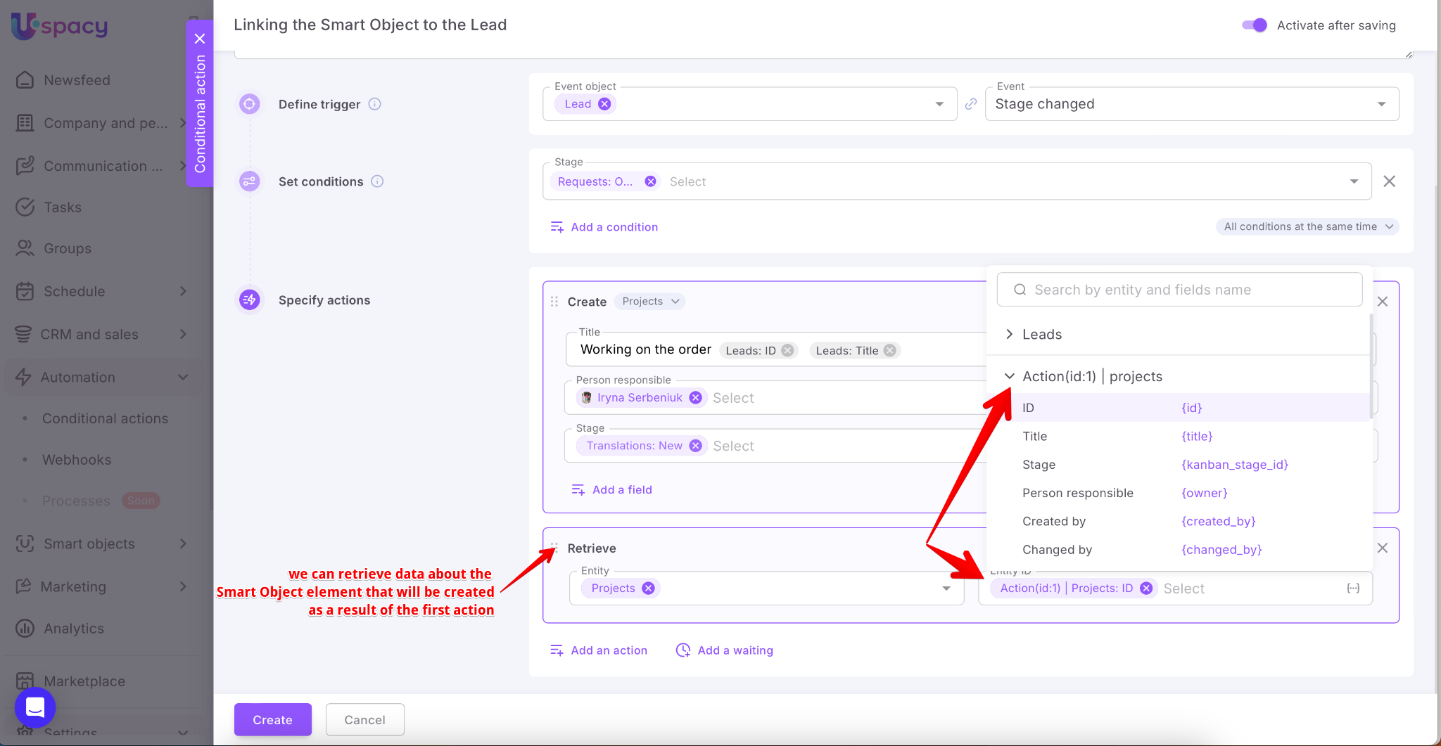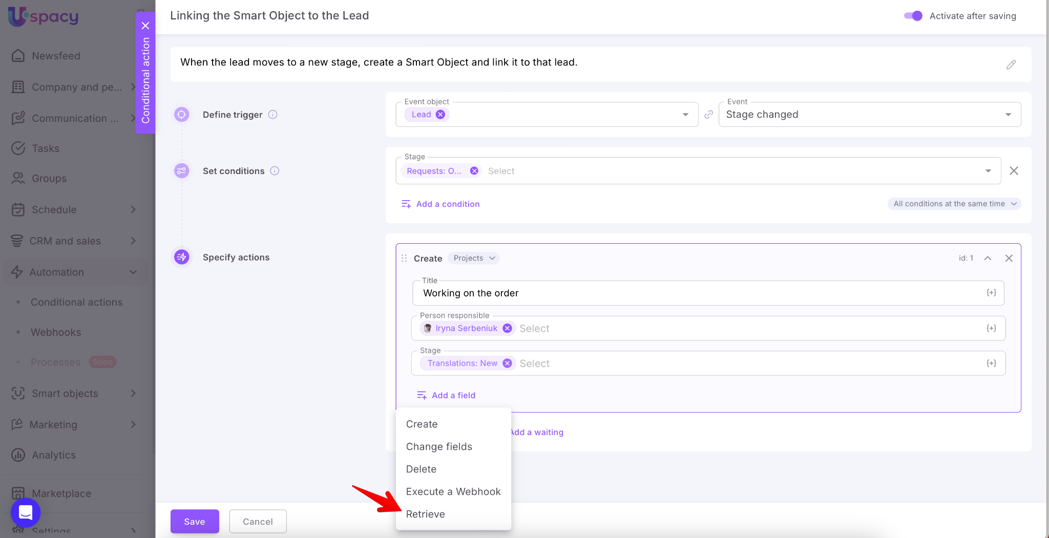 Select in which entity (lead, deal, contact, company, activity, task or comment) of your Space a new element will be added as a result of the automation.