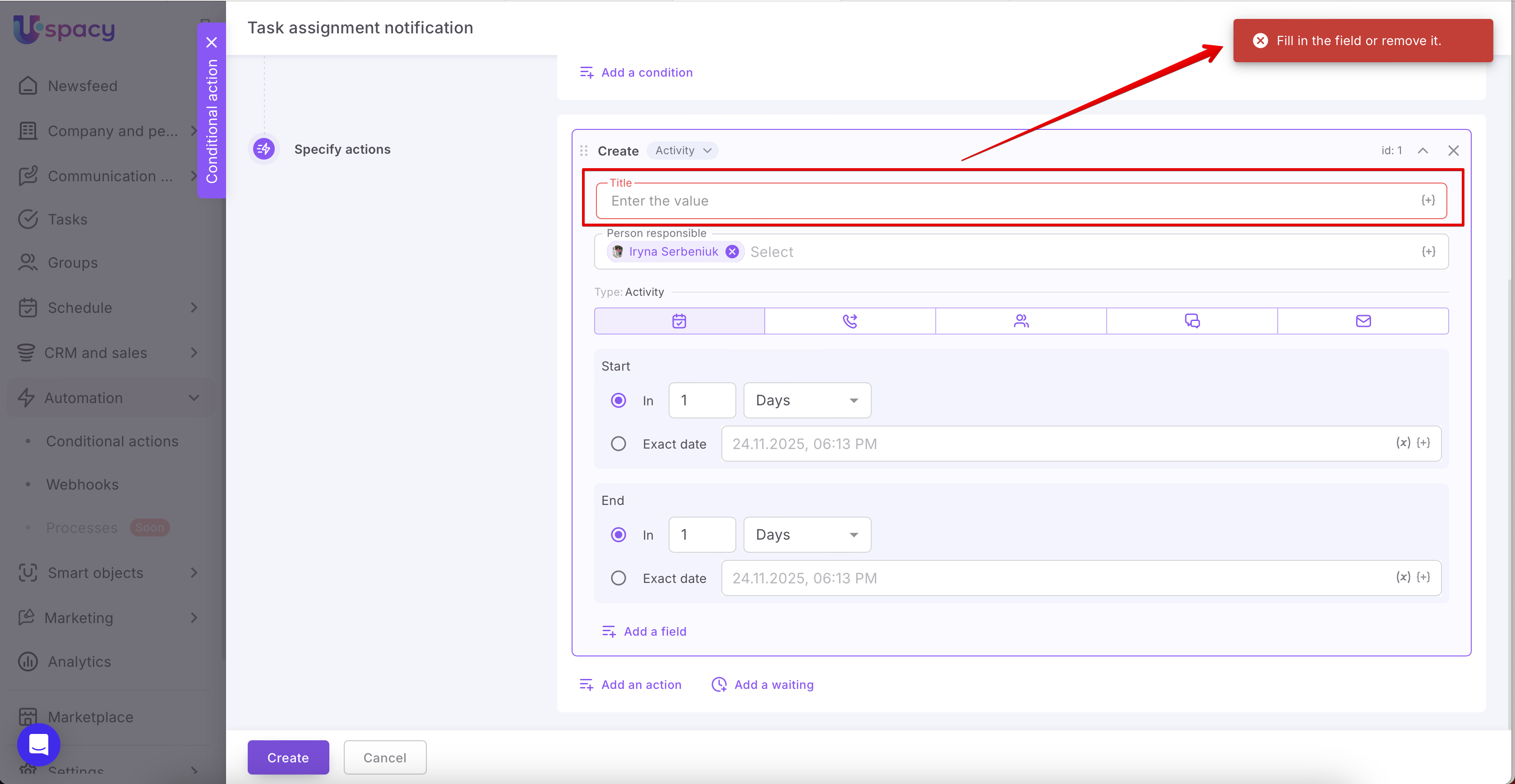 Use this action to notify a specific user about a particular event in the Workspace. When the conditional action is triggered, Uspacy automatically generates a notification with the specified text for the selected users and delivers it according to their configured notification preferences.