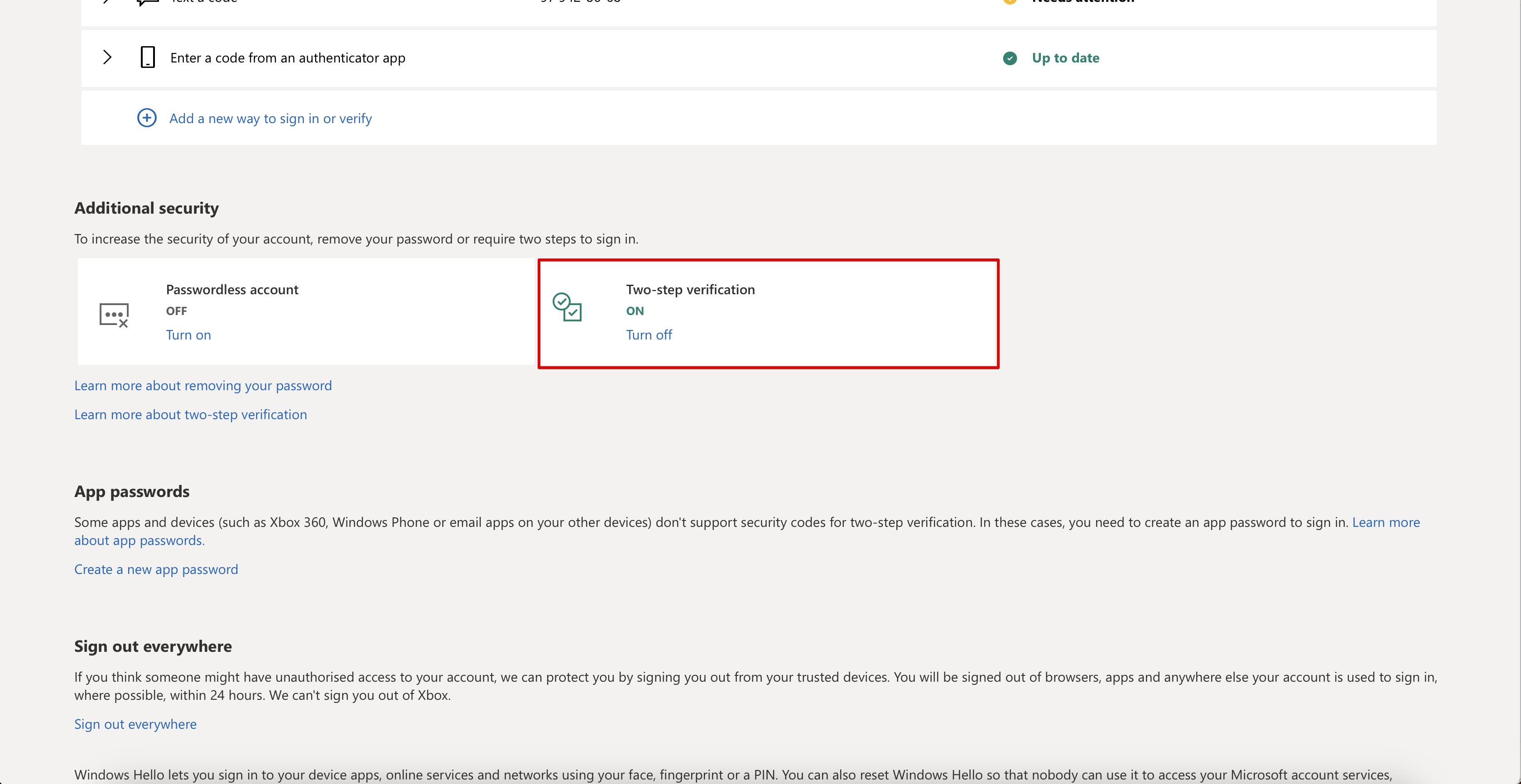 So, everything is ready. In your account security settings, you can see that two-step verification is turned on.