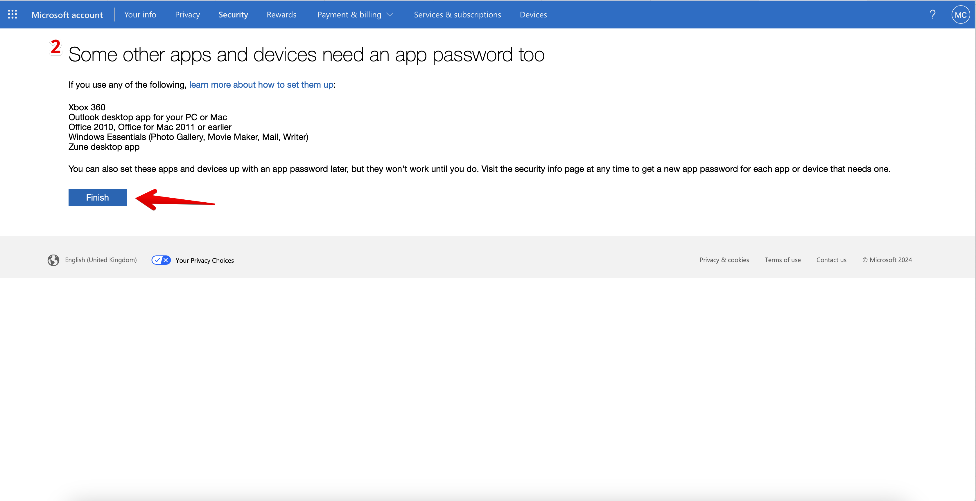 Go to the Security tab (2) in your Microsoft account settings (1).
