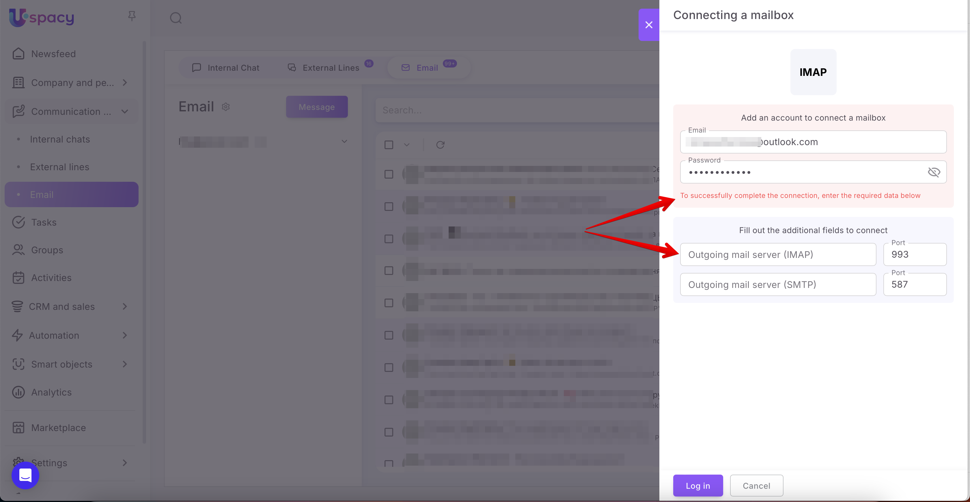 Next, enter the address of the mailbox you plan to connect, as well as the password that was generated in the Microsoft Outlook account settings. Finally, click Log in.