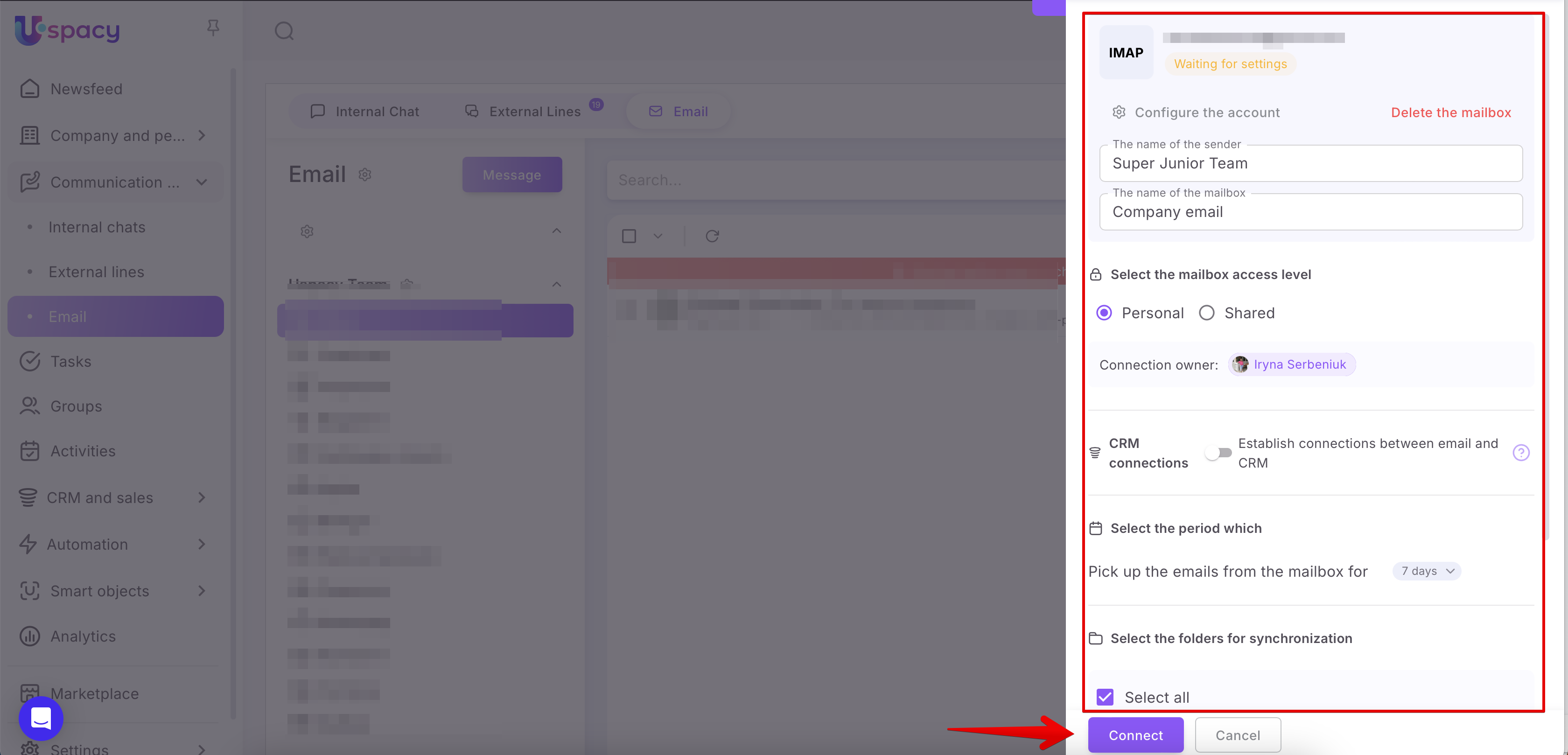 If it is successful, you will be redirected back to your Uspacy Space. A synchronization settings window will appear.
