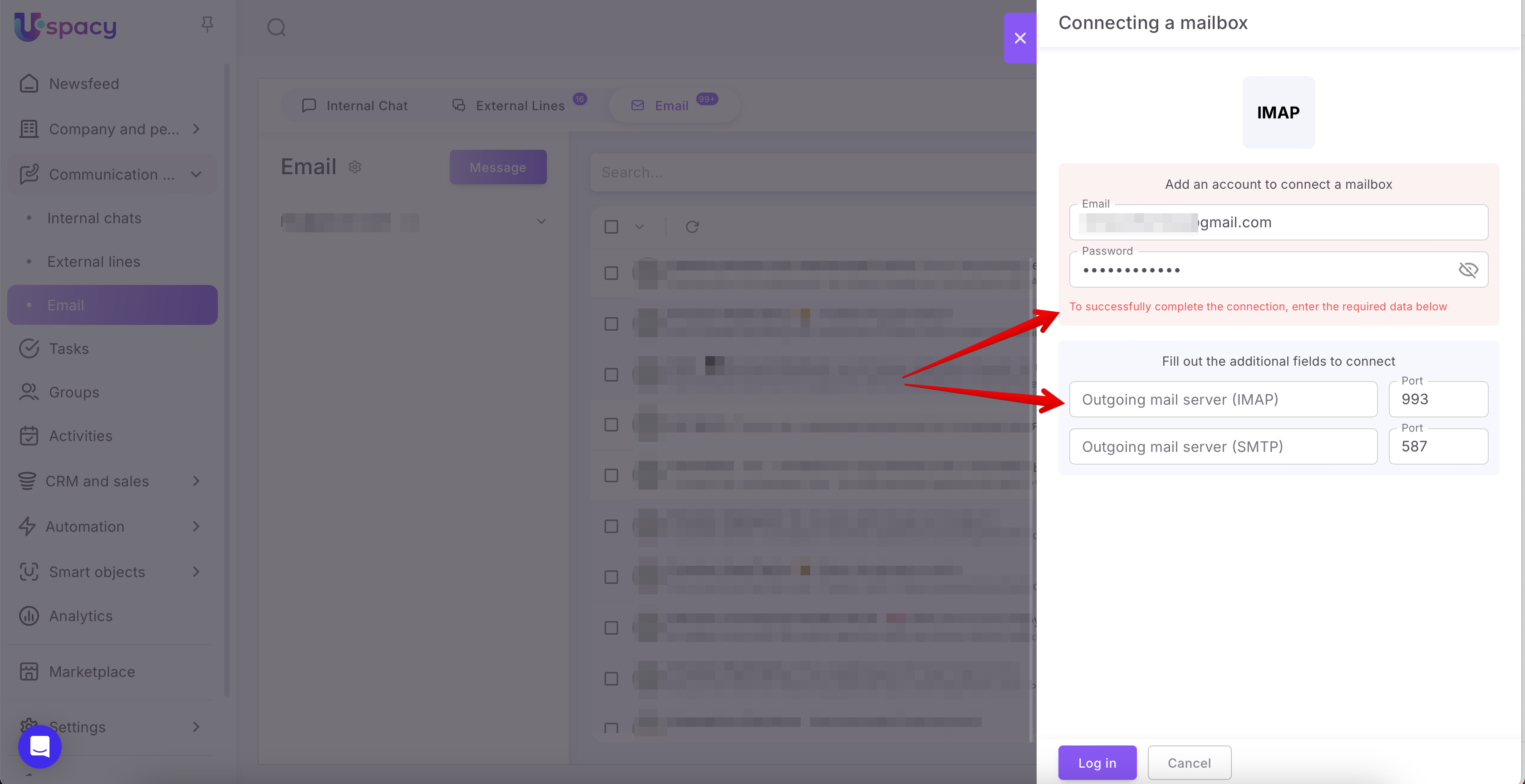 Next, enter the address of the mailbox that you plan to connect, as well as the password from it. Then, click Log in.