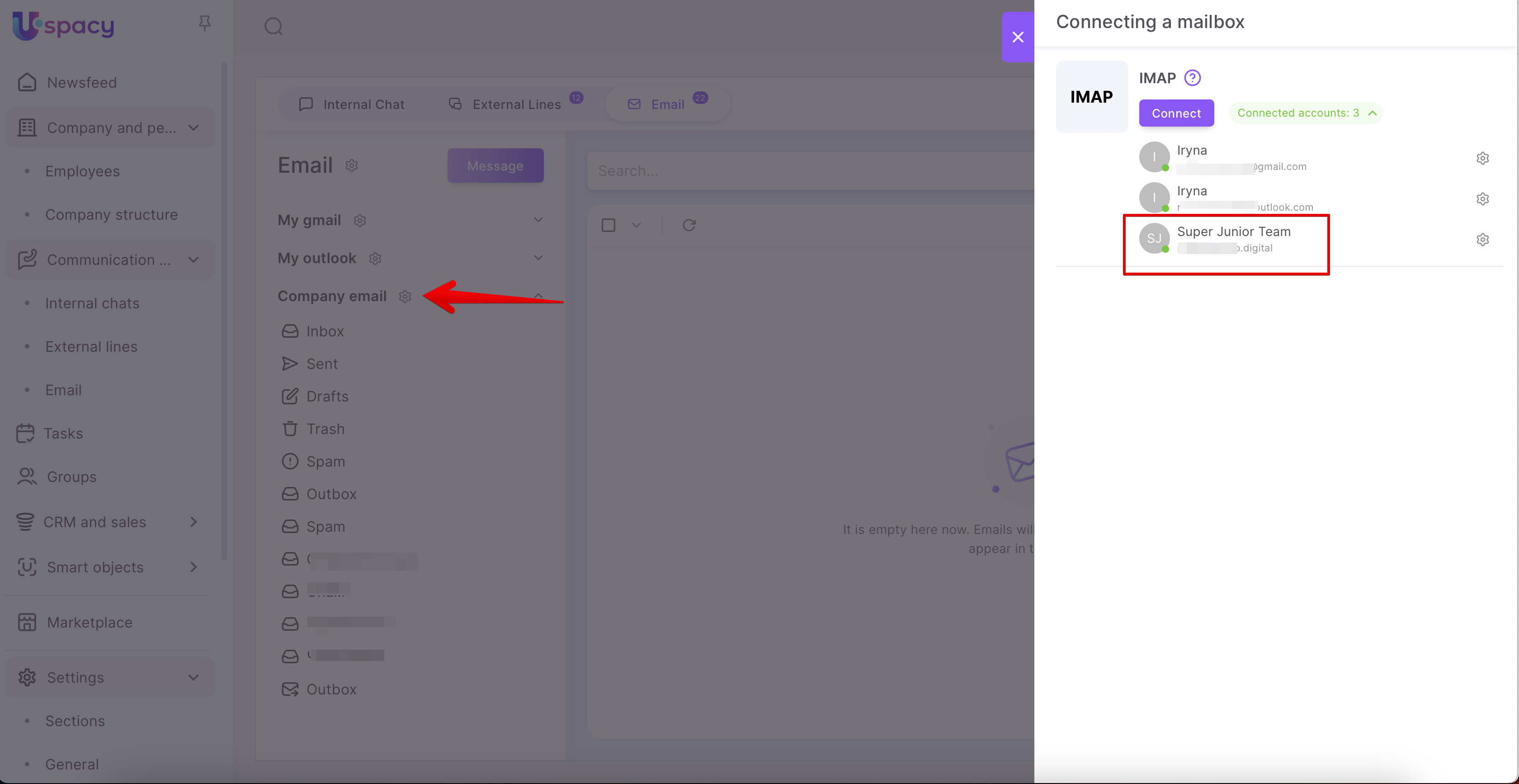 ❗️ Important! Before connecting your mailbox, please ensure that your email server has the folder structure correctly configured. Specifically, the "Sent" and "Trash" folders must exist. If they aren't available, an error might occur during the connection process. Therefore, we recommend checking for or creating these folders in your email system first, and only then connecting your mailbox to the Uspacy Space.
