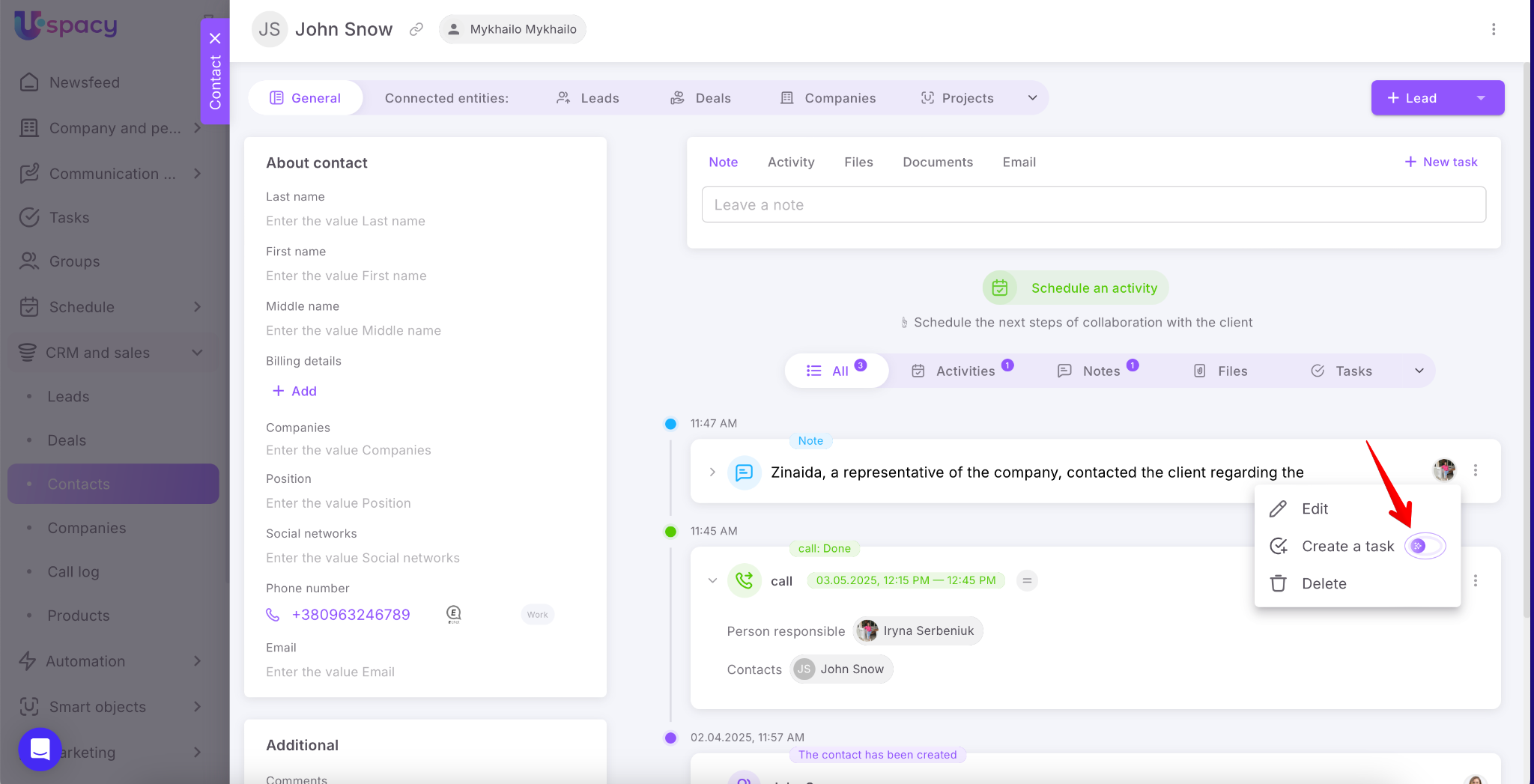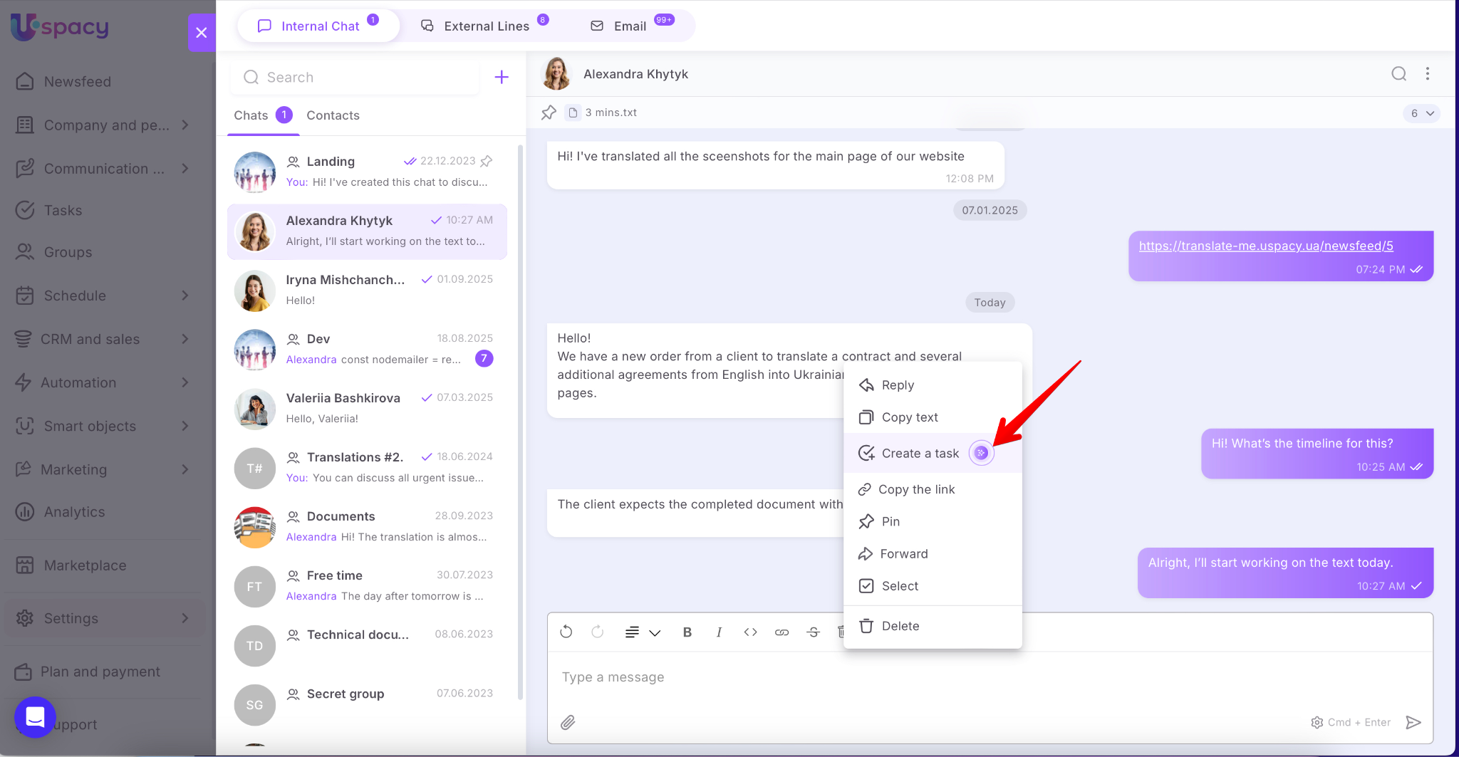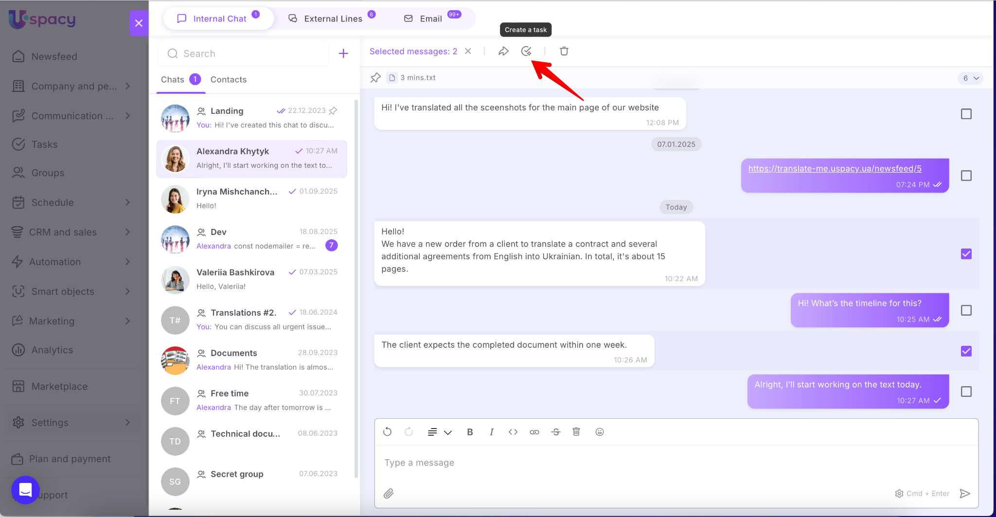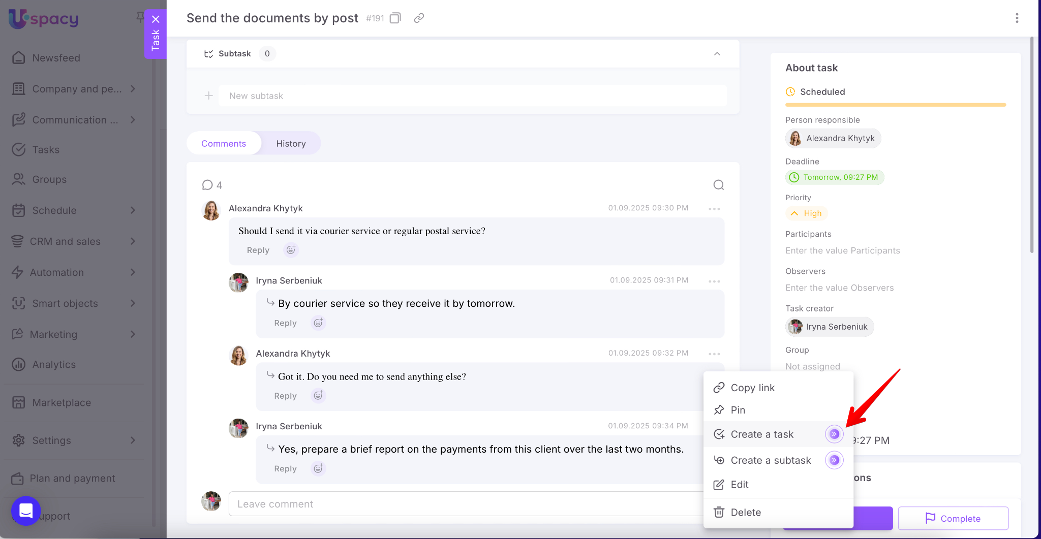 Uspacy helps automate workflows and save time. Now you can create tasks directly from messages, comments, and notes. This feature is powered by artificial intelligence – one click, and the smart assistant prepares the task with all necessary details.