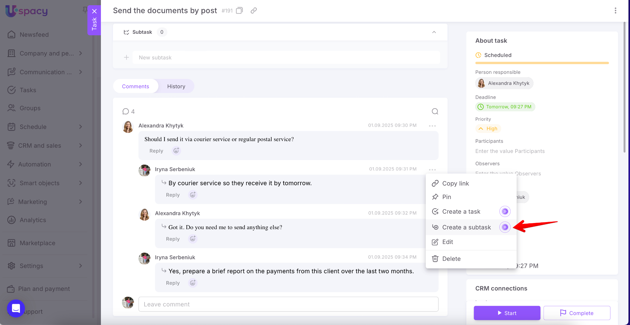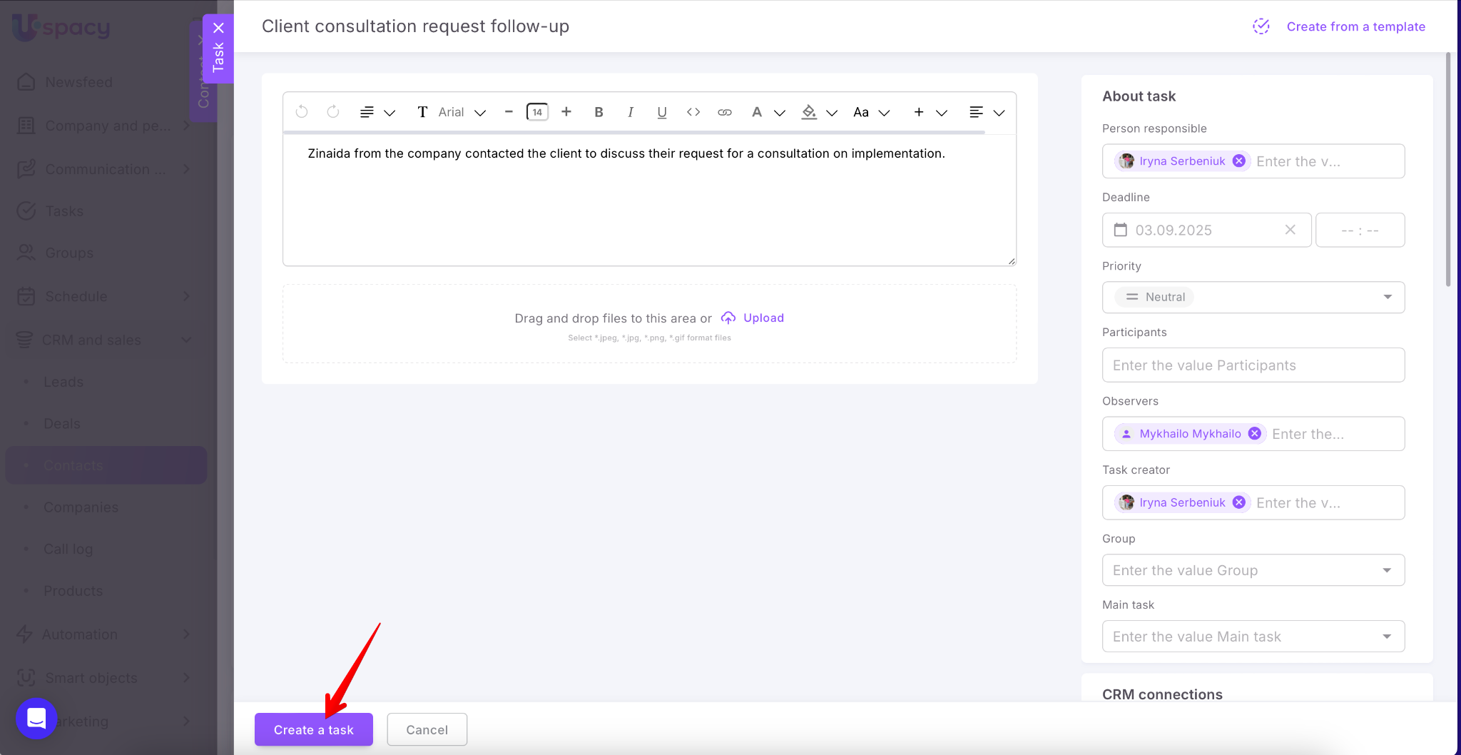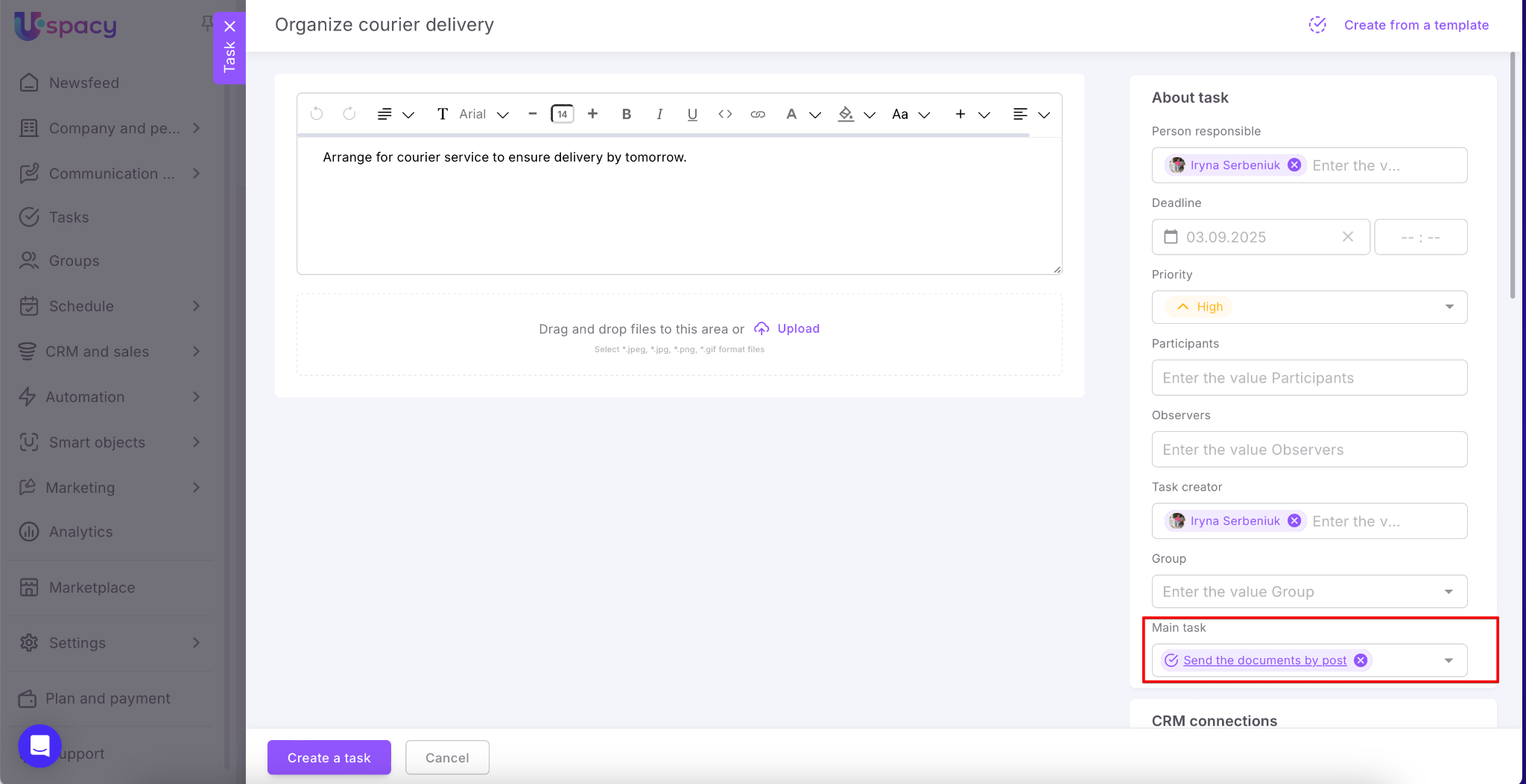 Uspacy helps automate workflows and save time. Now you can create tasks directly from messages, comments, and notes. This feature is powered by artificial intelligence – one click, and the smart assistant prepares the task with all necessary details.