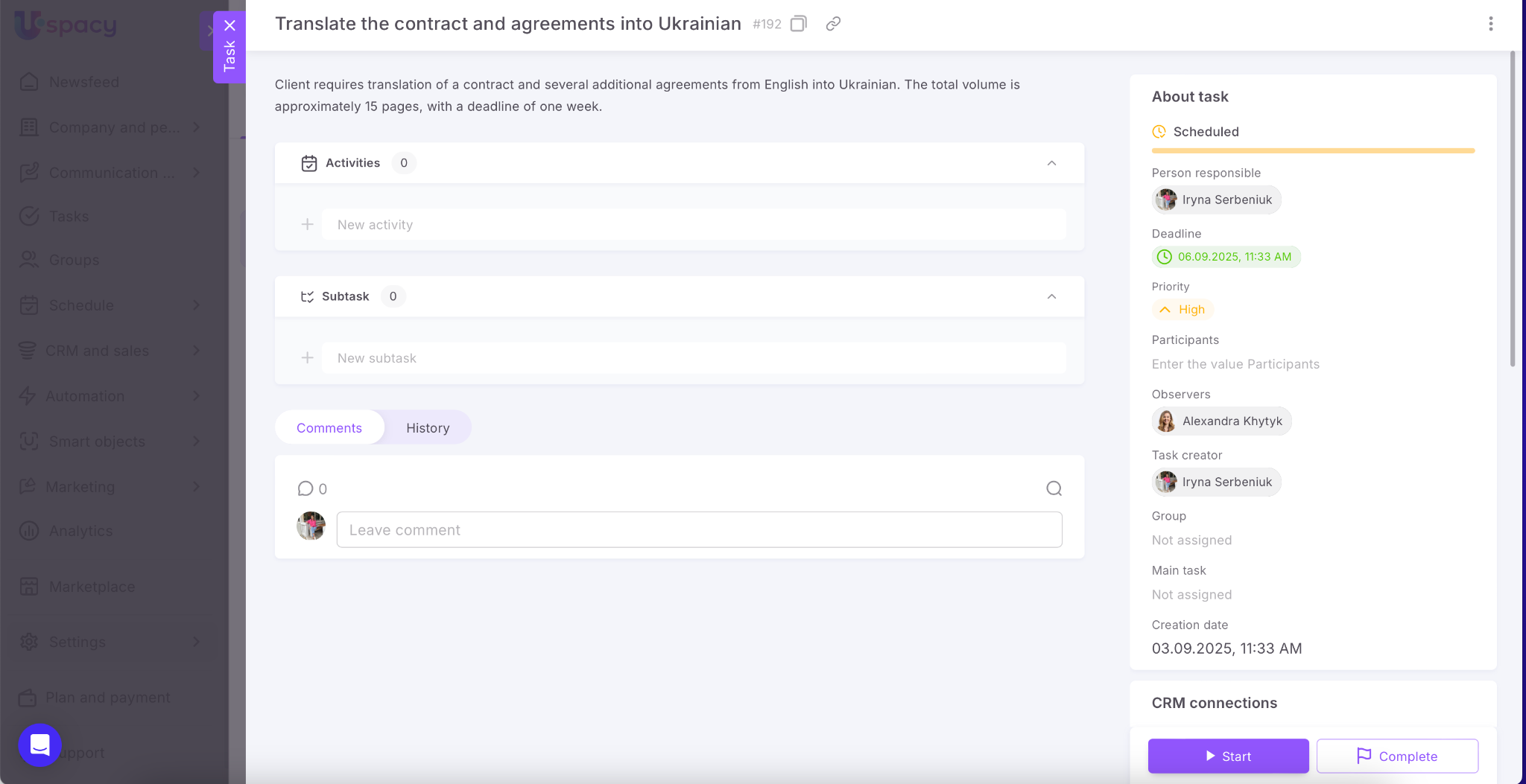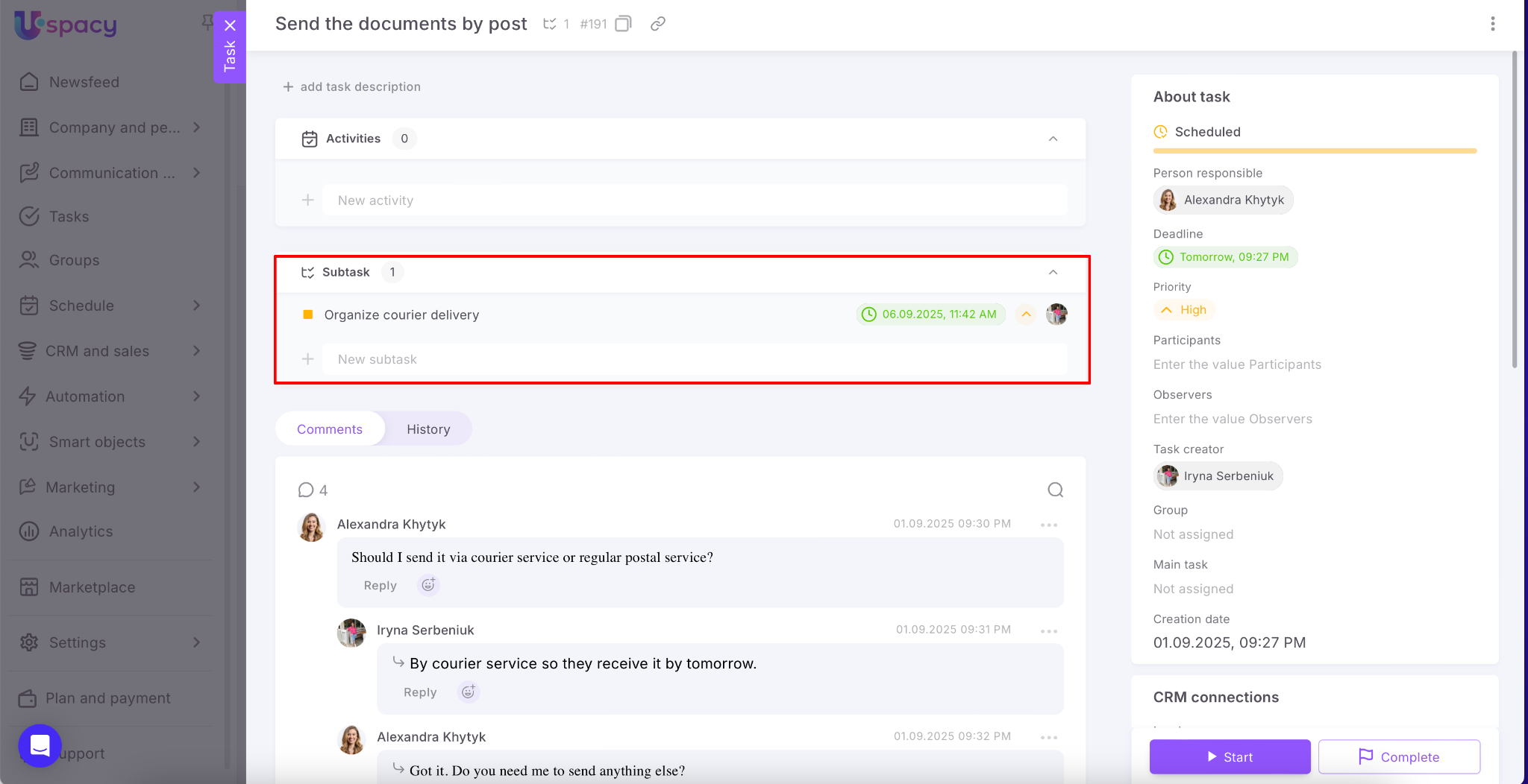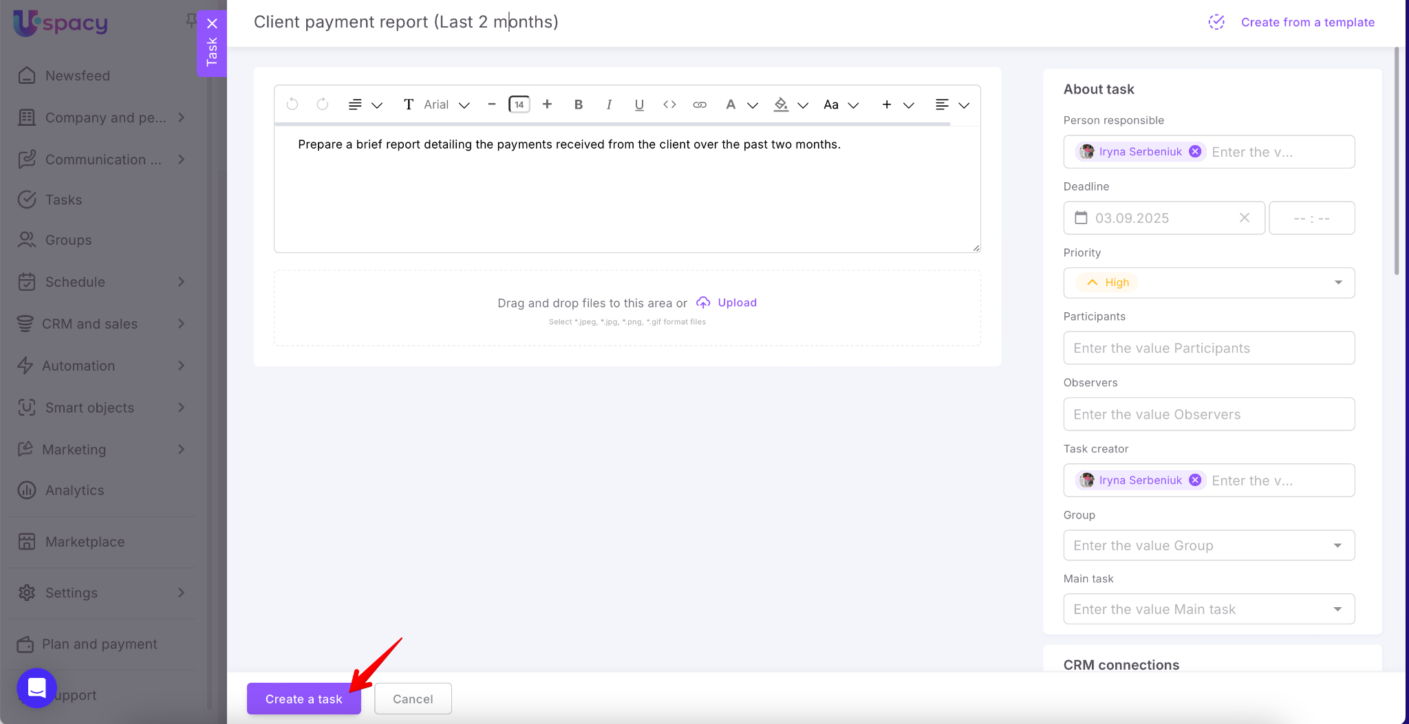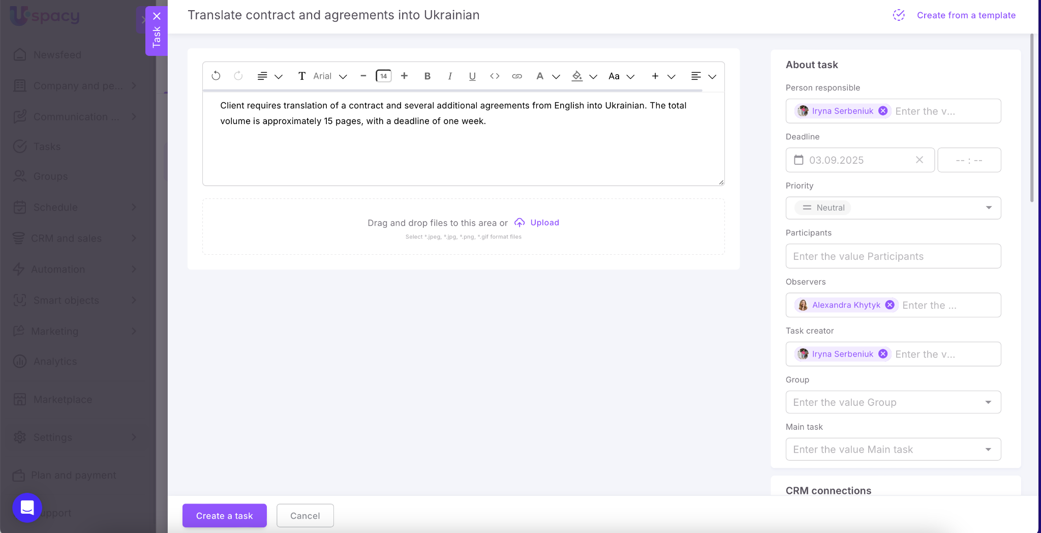 Uspacy helps automate workflows and save time. Now you can create tasks directly from messages, comments, and notes. This feature is powered by artificial intelligence – one click, and the smart assistant prepares the task with all necessary details.