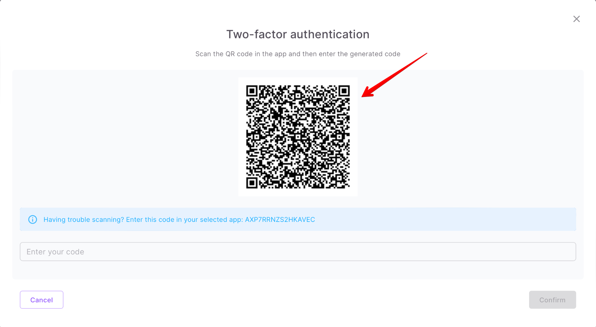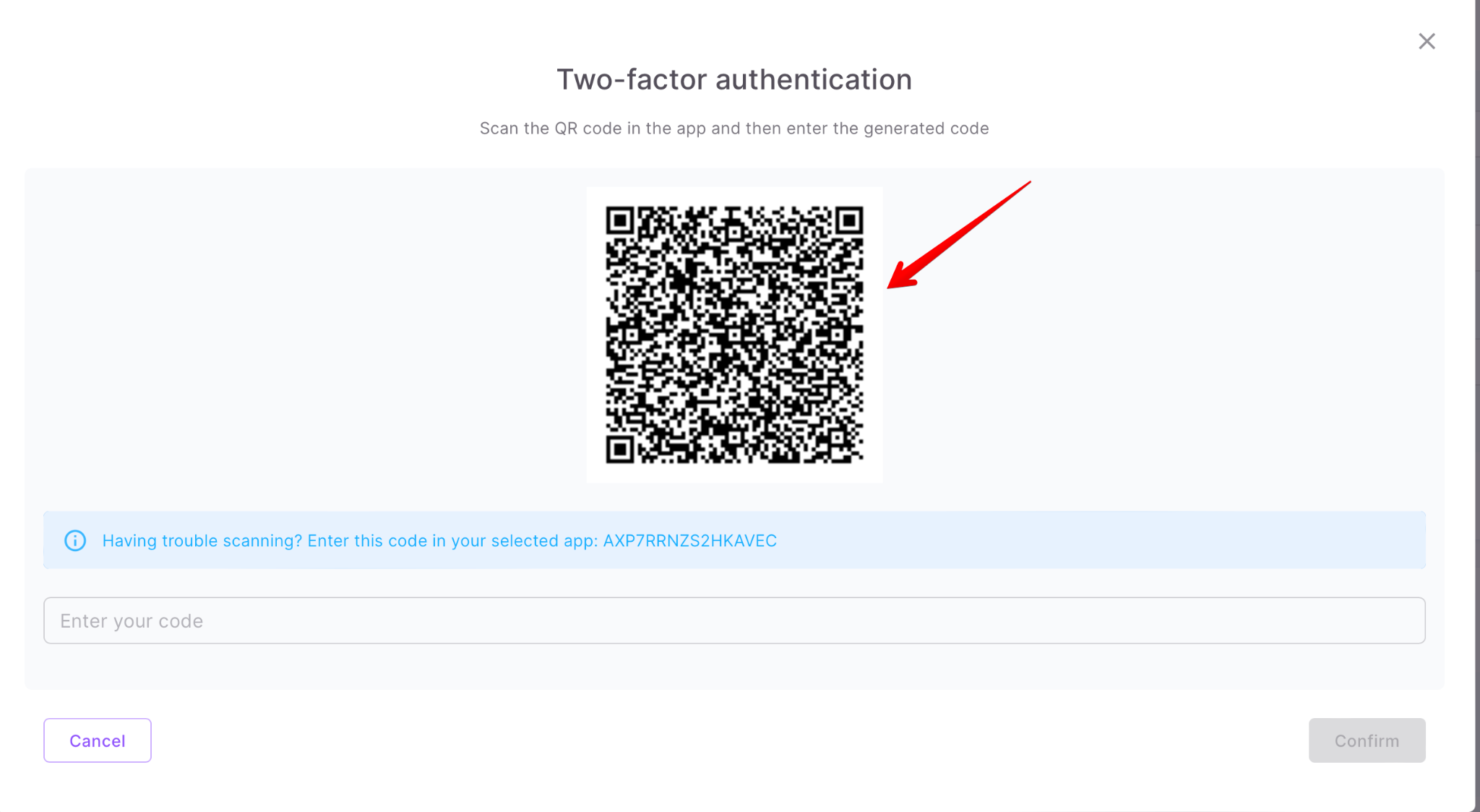 So, next you need to scan the QR code that will be shown in your profile on the form to enable two-factor authentication: