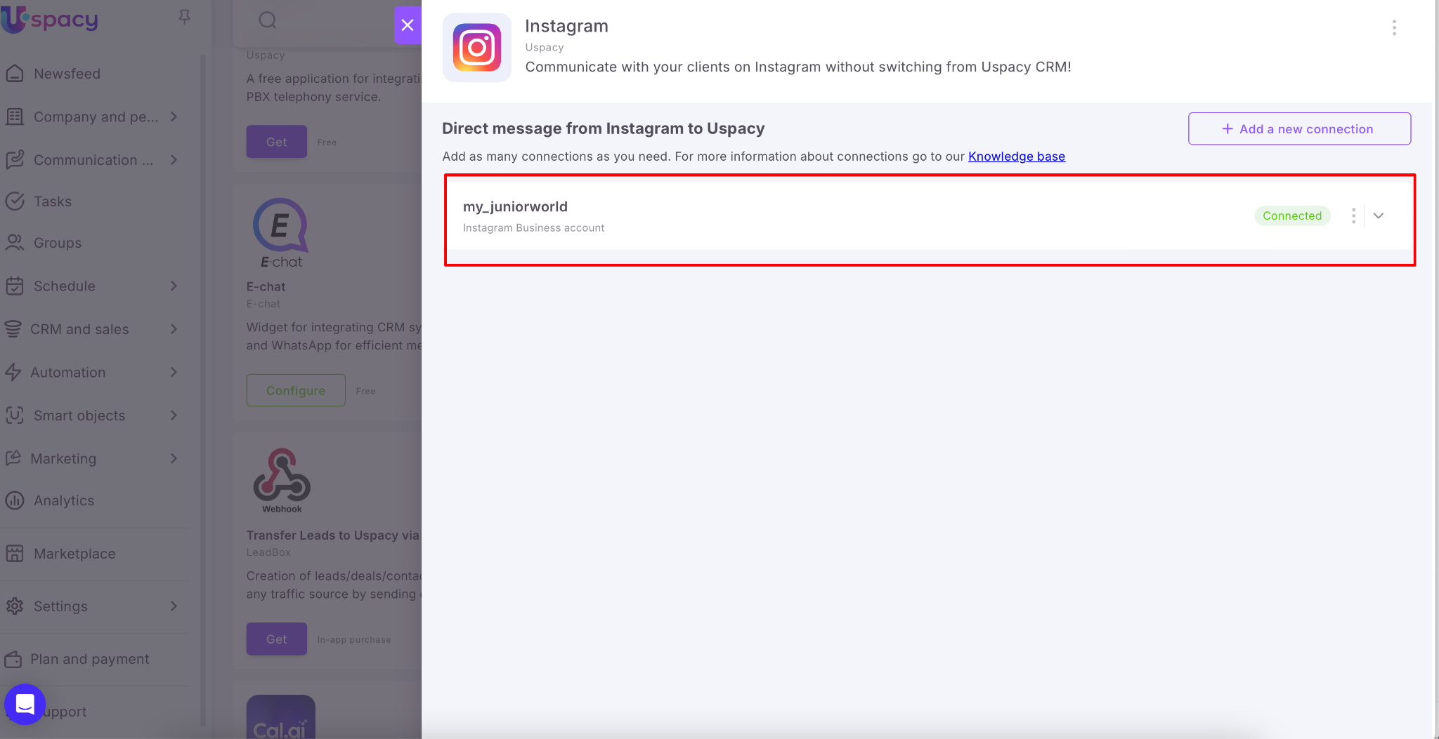 💡 After connecting your first Instagram account to Space, the Add new connection button will appear in the settings. If you have several Instagram accounts and want to connect them all, you can easily do it.