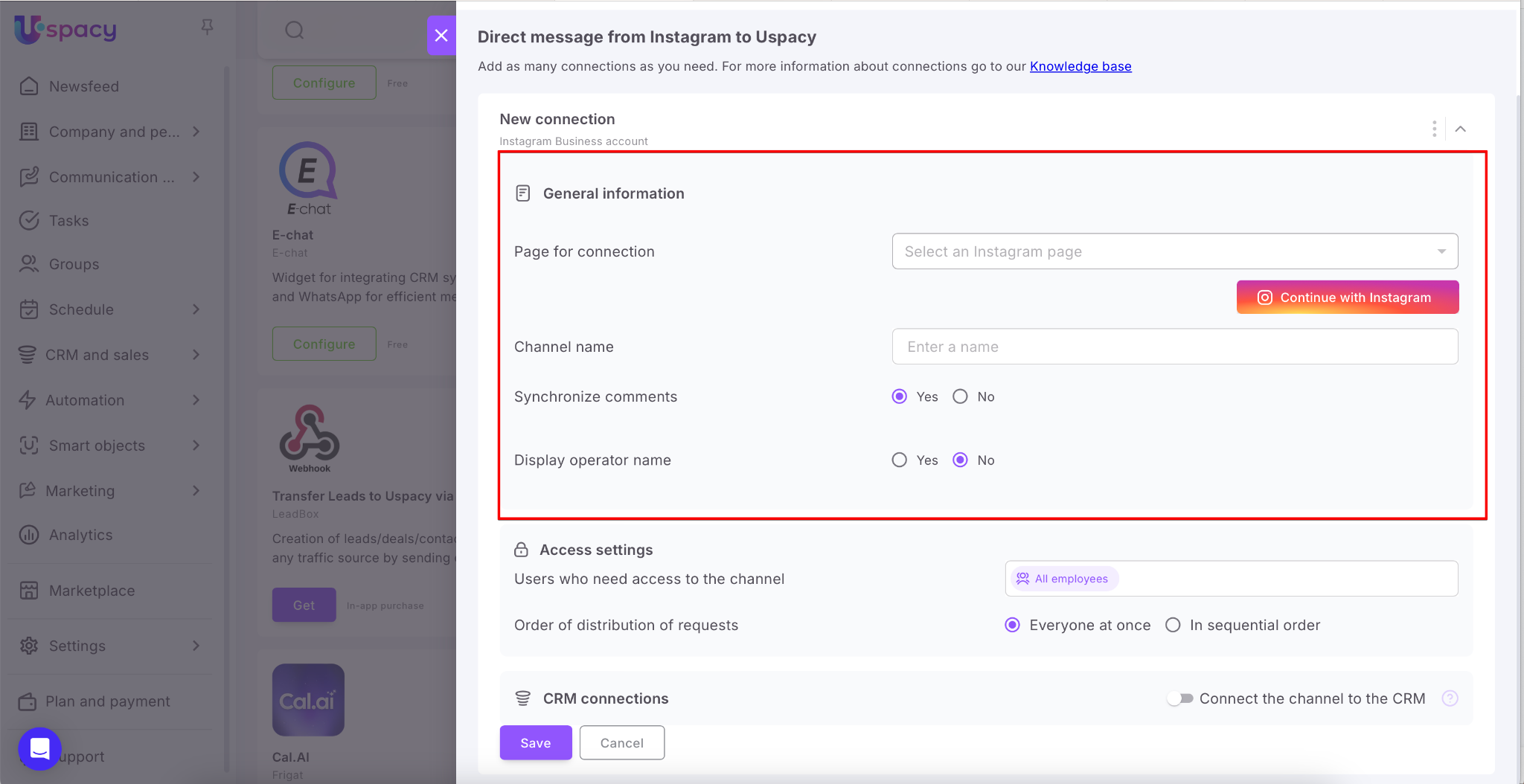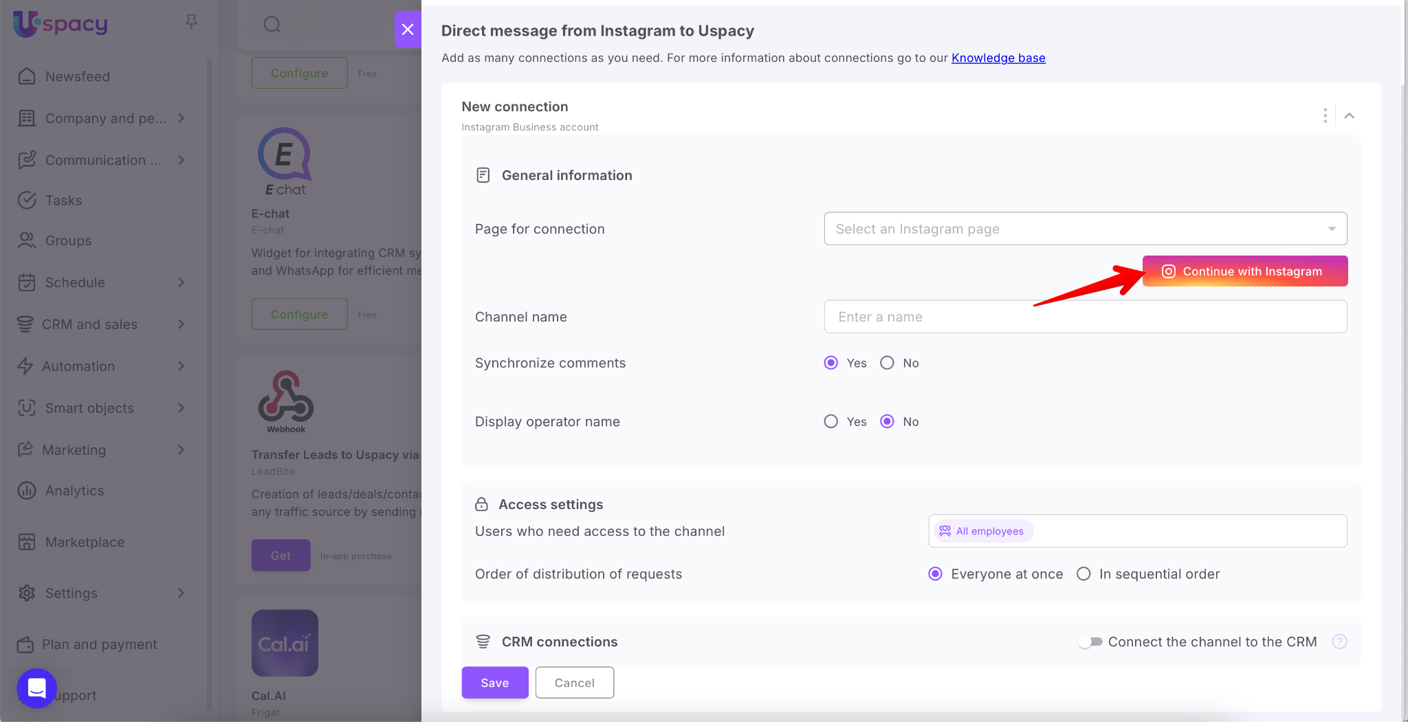 Therefore, for correct operation of Instagram, you will need to perform preparatory actions, and then configure the connection at Uspacy. In addition, the integration with Instagram is implemented through the link to Facebook.