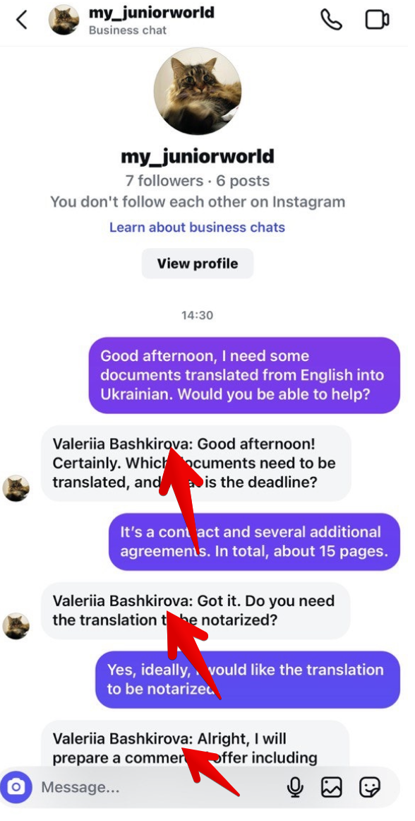 A client contacts you via your business Instagram account — for example, by leaving a comment under a post, a Reel, or sending a message in Direct. If the “Display operator name” option is enabled, the client will be able to see which representative from your company is responding.