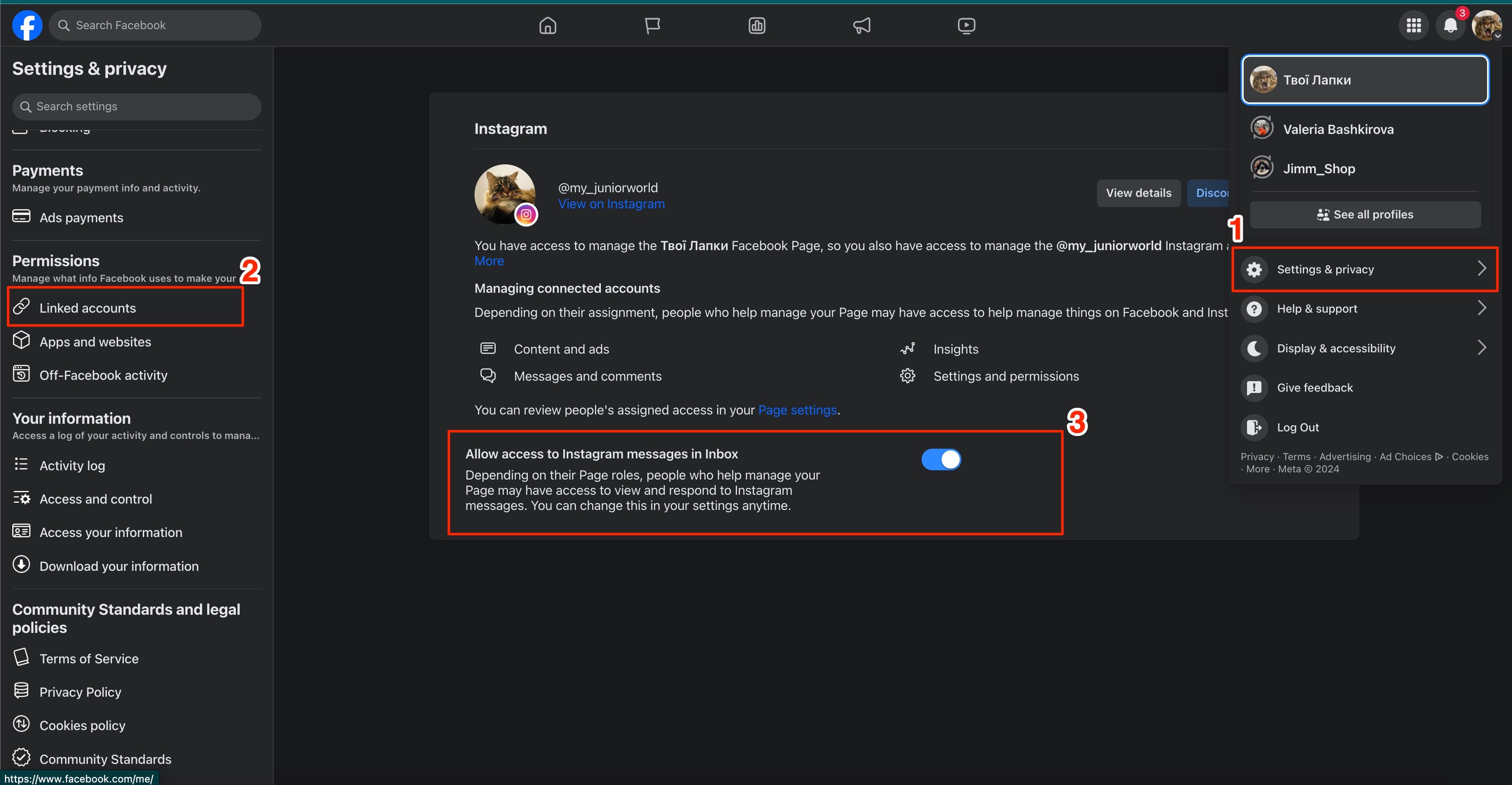 For everything to work correctly after updating the settings, you need to activate two-factor authentication for the account that manages your Facebook business page (if you didn’t already do this during the connection process).