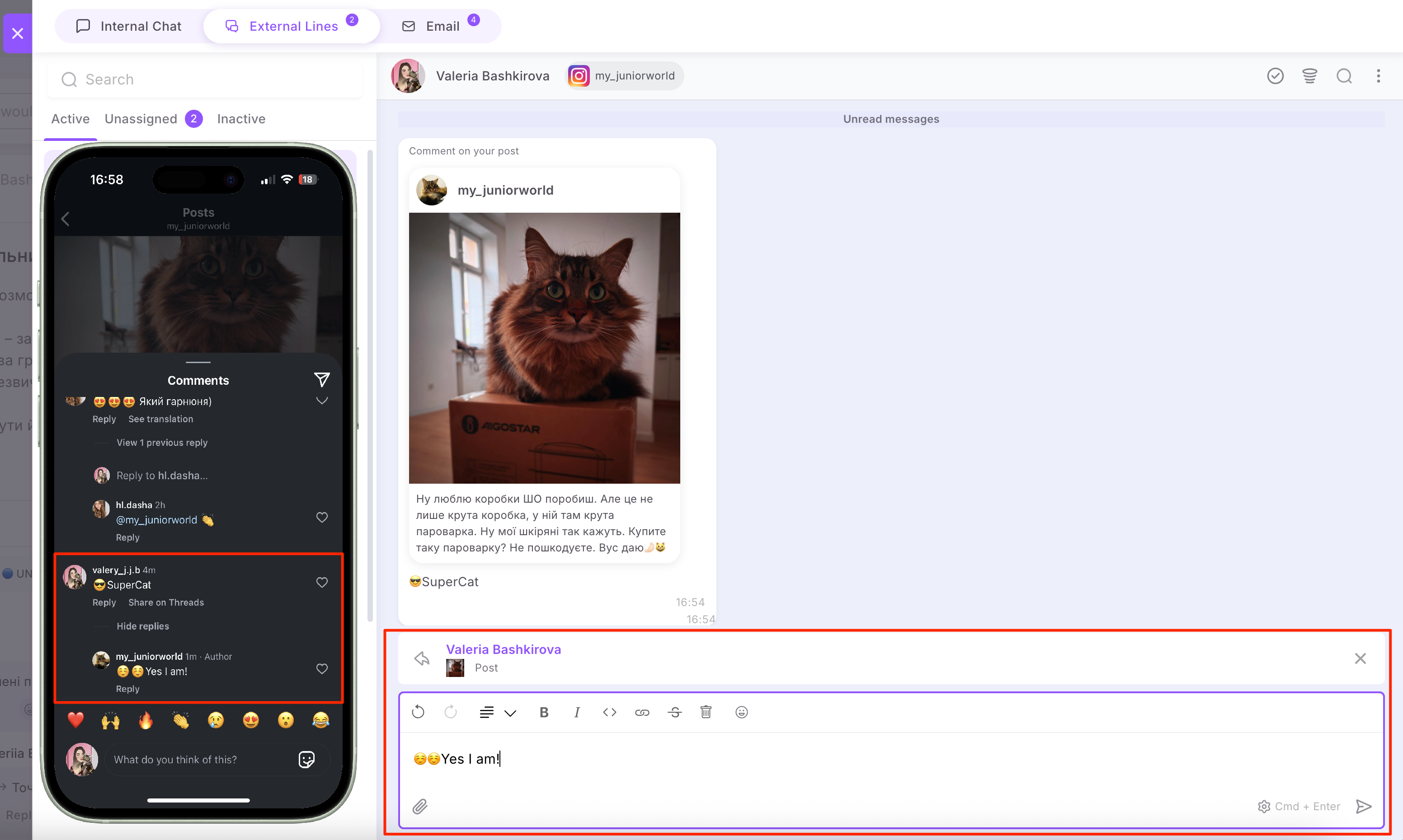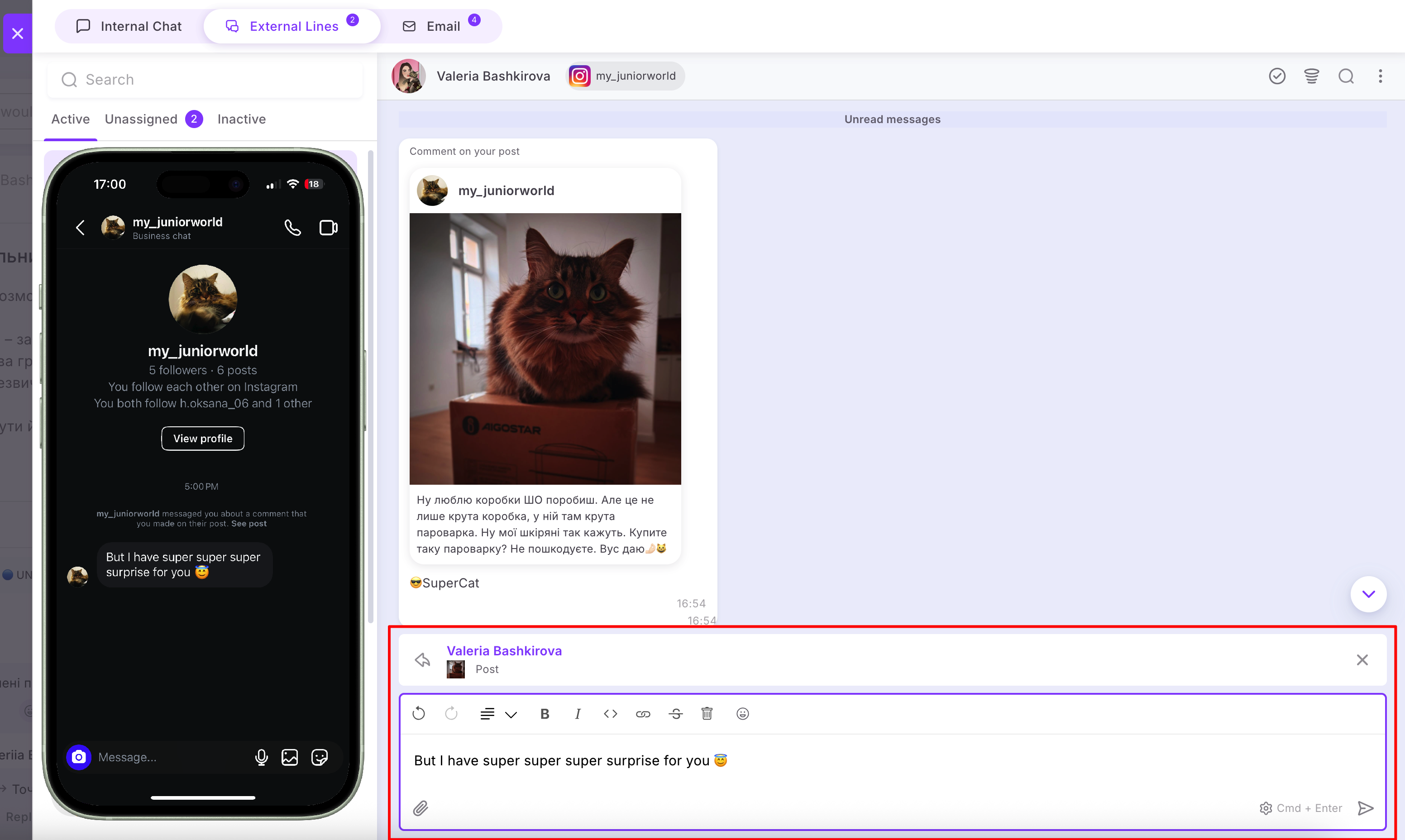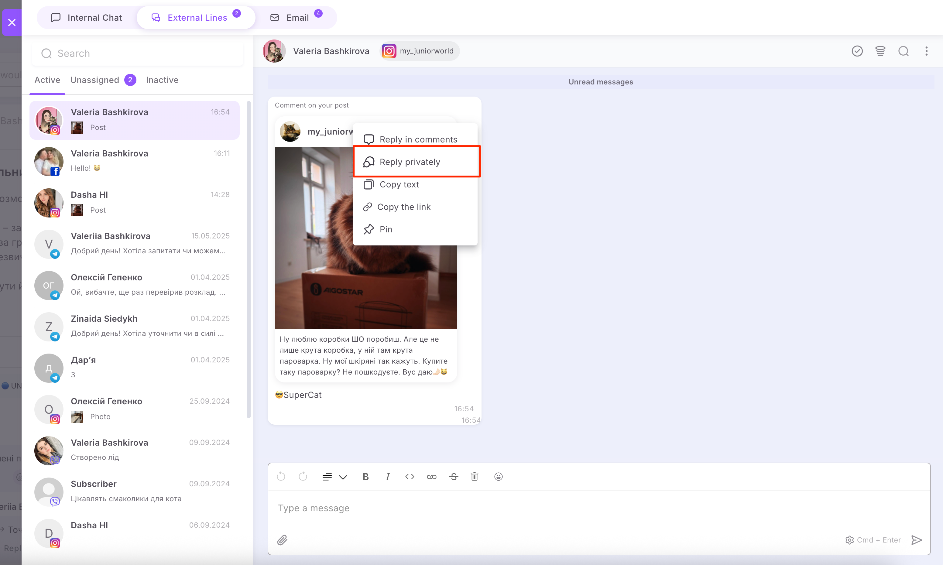 🟣 Also, if a conversation with a client started from a comment on a post or Reels, you can only send one message from the platform as your first private reply to them. After that, you need to wait for the client to reply. Once they do, you can send subsequent messages one by one, and all messages will be delivered in the order they were sent.