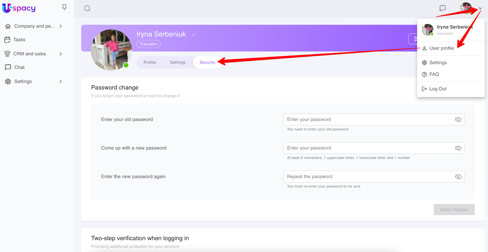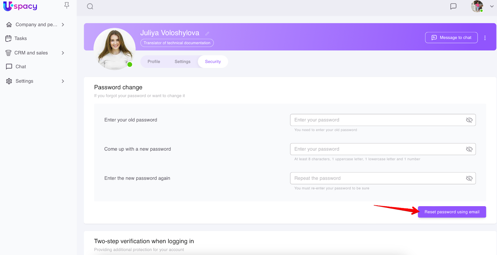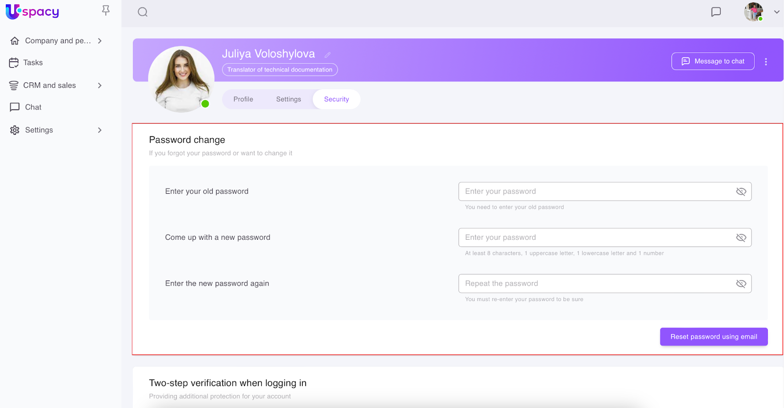 The possibility to change the password is one of the components of the additional protection and security of the Uspacy user account.