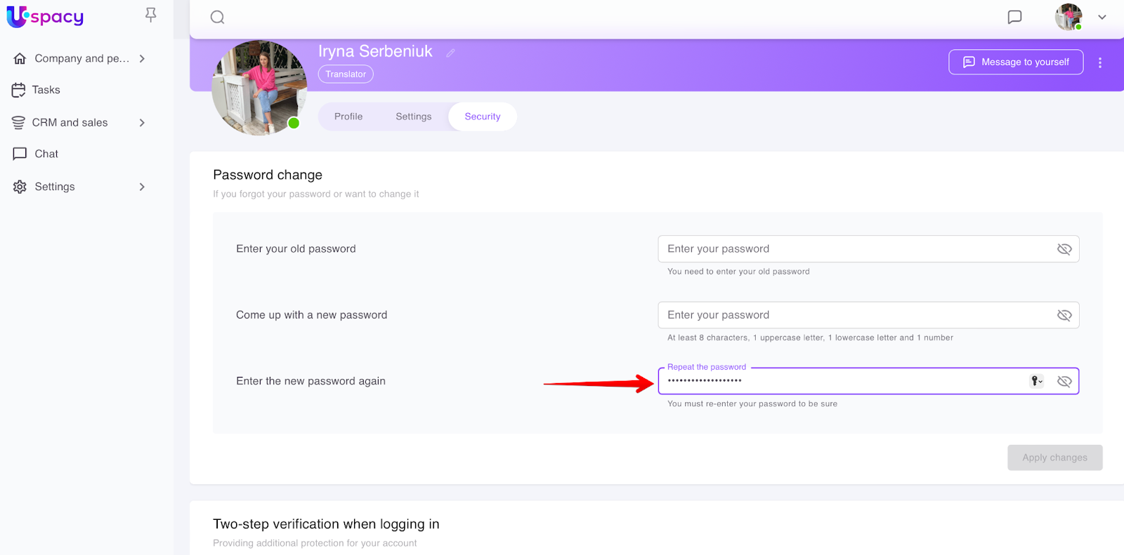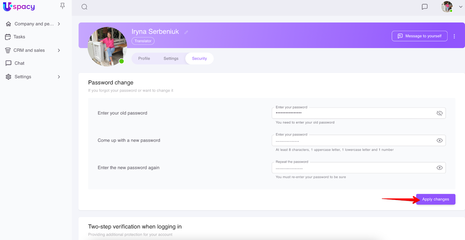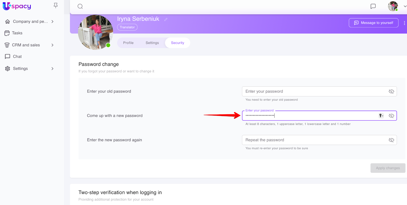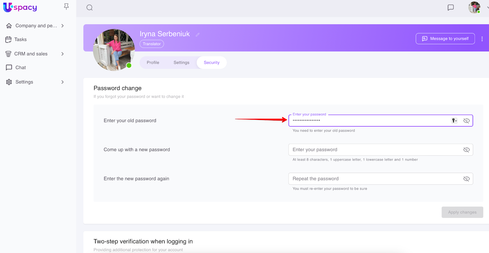 The possibility to change the password is one of the components of the additional protection and security of the Uspacy user account.