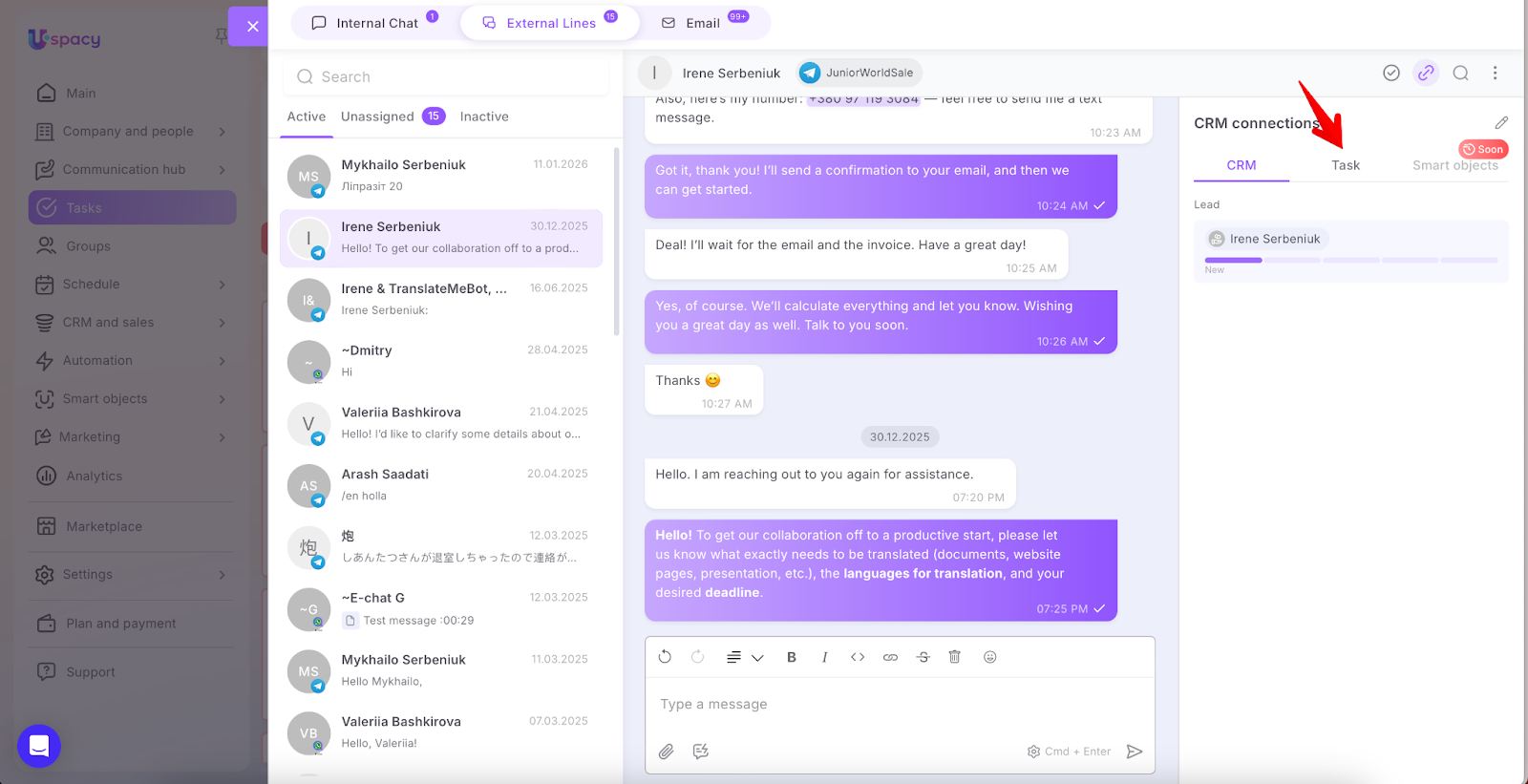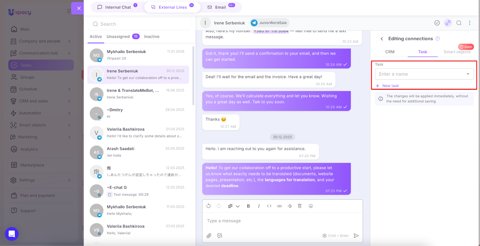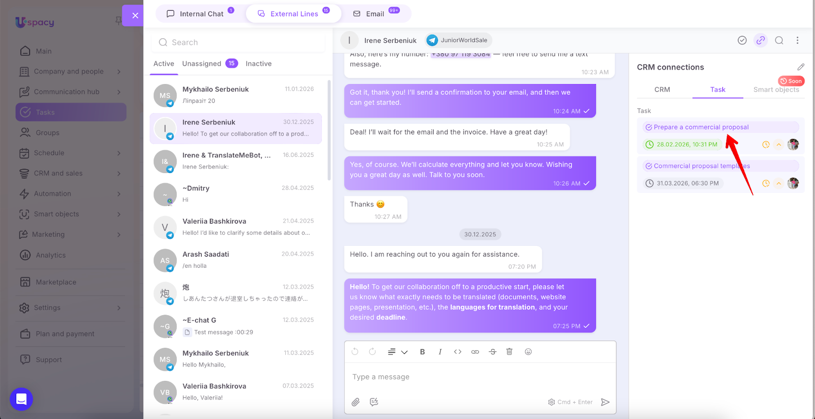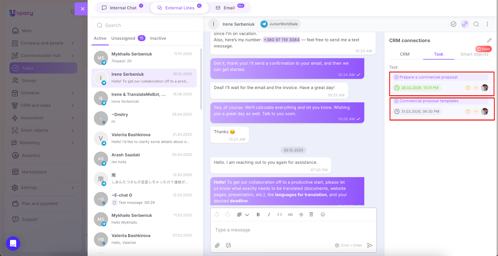 When clients reach out via messengers, it’s important not only to respond quickly but also to record agreements—call back, prepare a proposal, clarify details, or forward a request to a colleague. That’s why Uspacy makes it easy to work with chats from External Lines (channels) directly in the Communication hub—you manage the conversation within the Workspace without switching between multiple services.