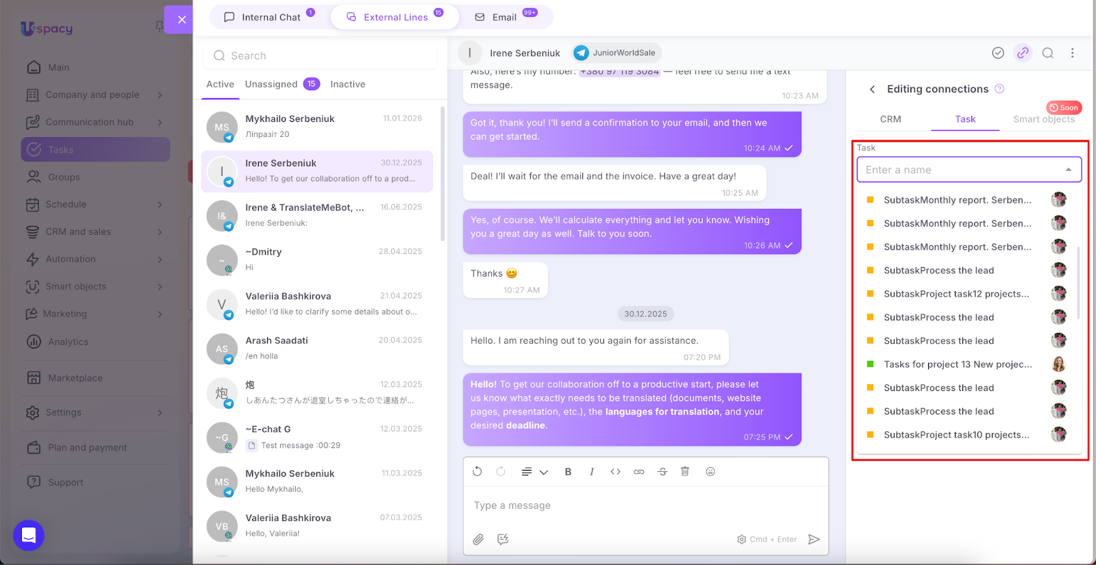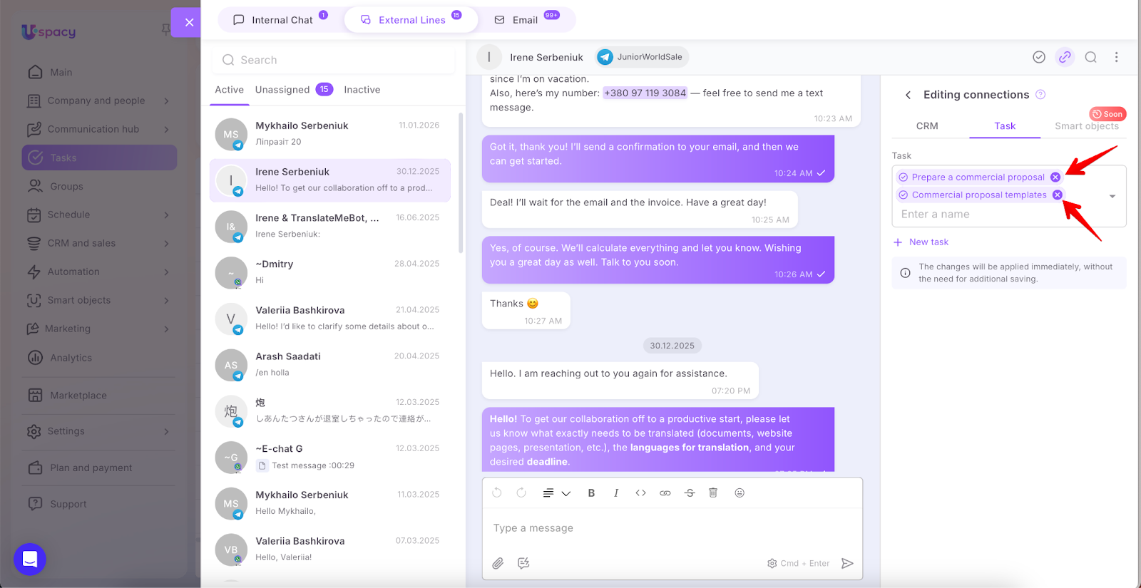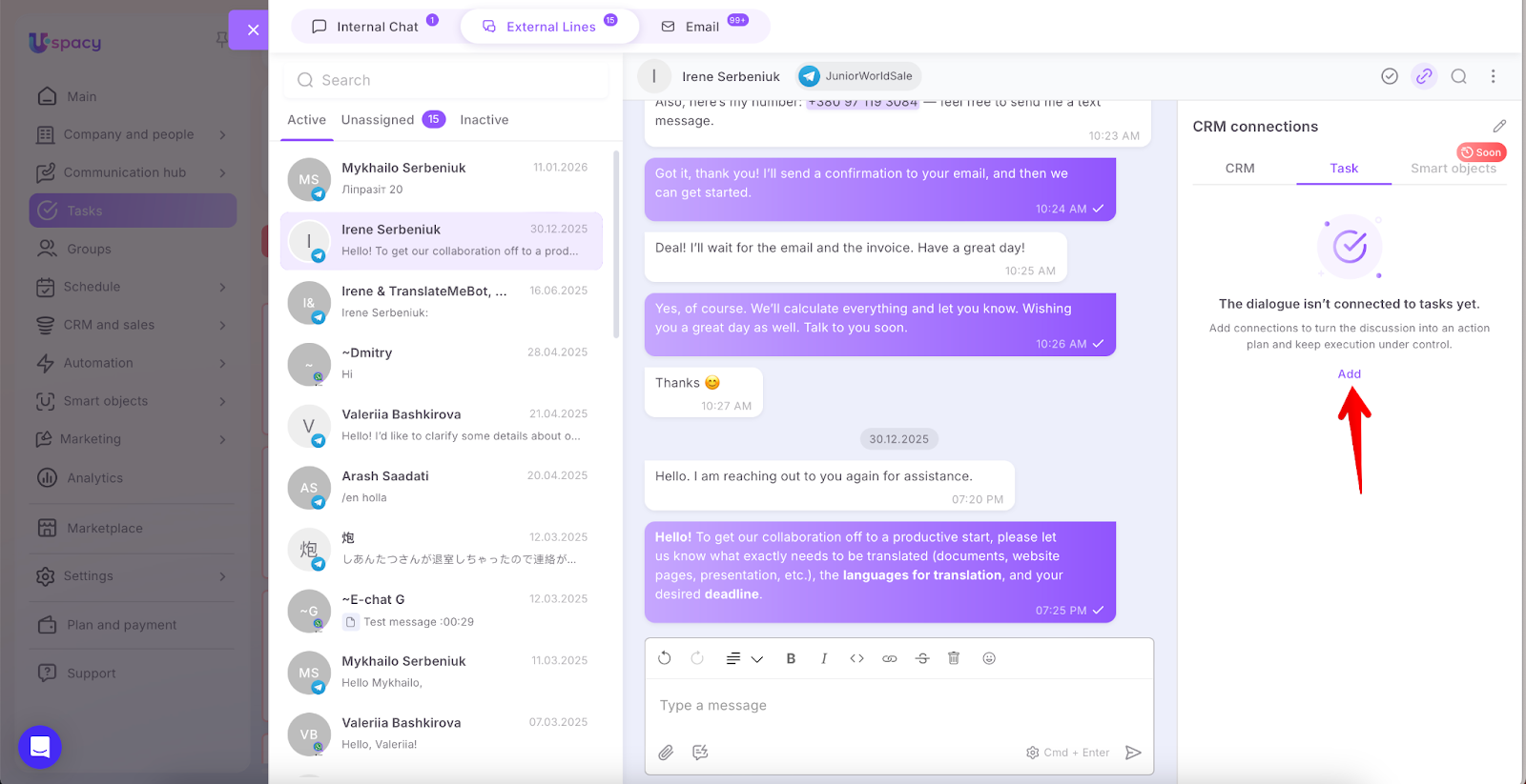 When clients reach out via messengers, it’s important not only to respond quickly but also to record agreements—call back, prepare a proposal, clarify details, or forward a request to a colleague. That’s why Uspacy makes it easy to work with chats from External Lines (channels) directly in the Communication hub—you manage the conversation within the Workspace without switching between multiple services.