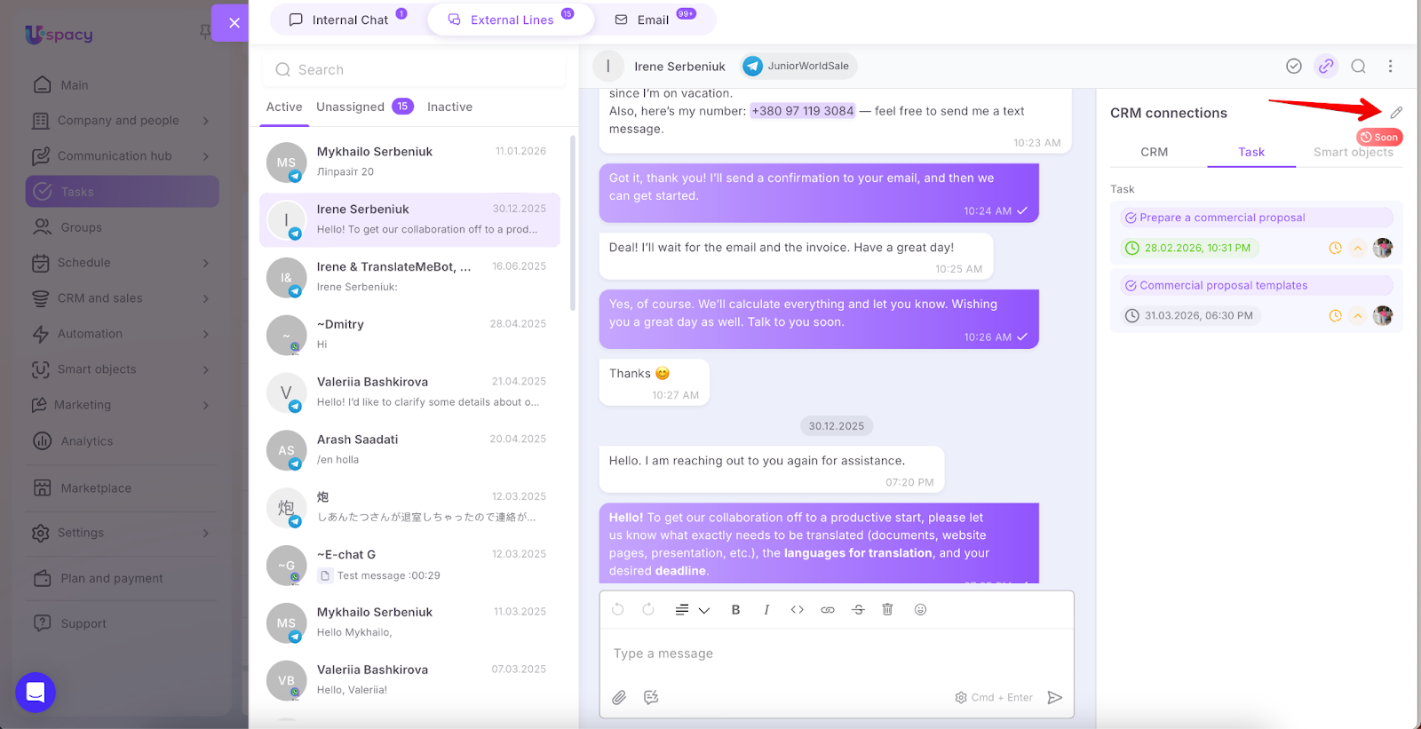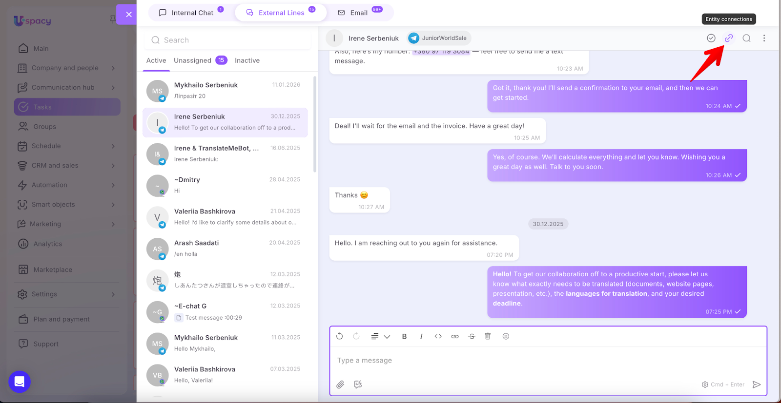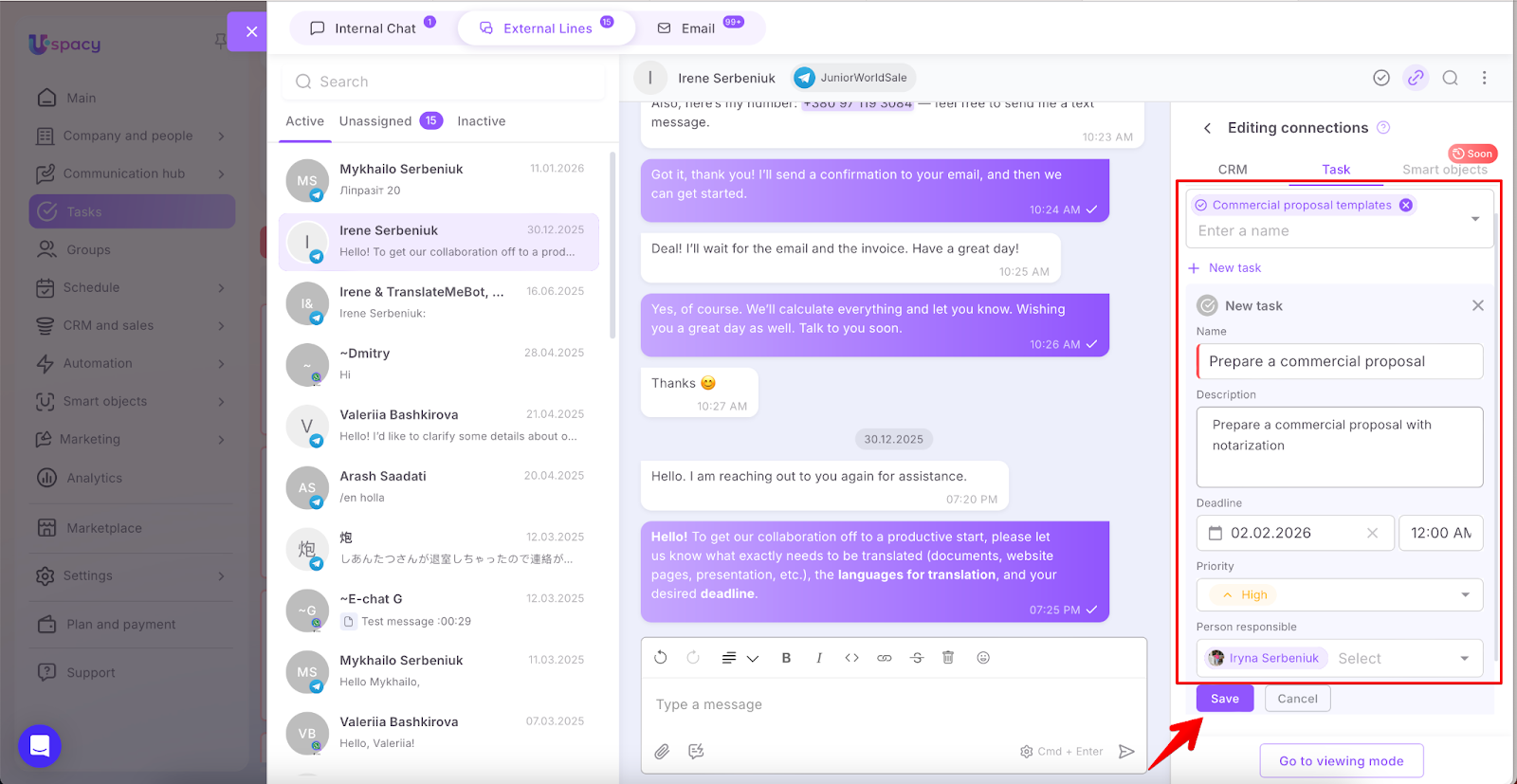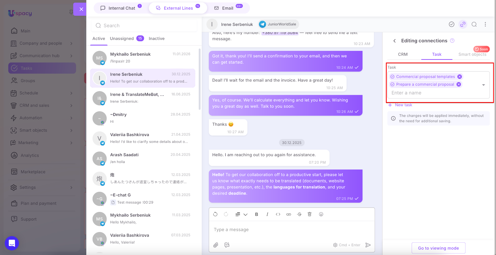 When clients reach out via messengers, it’s important not only to respond quickly but also to record agreements—call back, prepare a proposal, clarify details, or forward a request to a colleague. That’s why Uspacy makes it easy to work with chats from External Lines (channels) directly in the Communication hub—you manage the conversation within the Workspace without switching between multiple services.