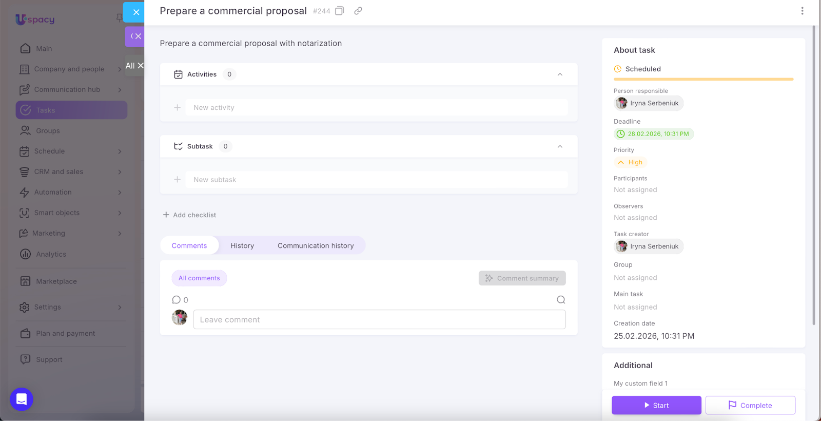 After a dialogue, next steps usually emerge. If it’s a quick action at a specific time (call back, schedule a meeting, send a message), it’s convenient to record it as an activity linked to the client in the CRM. If the work is more complex and requires structure (description, checklist, subtasks, multiple participants), you can link it to Tasks.