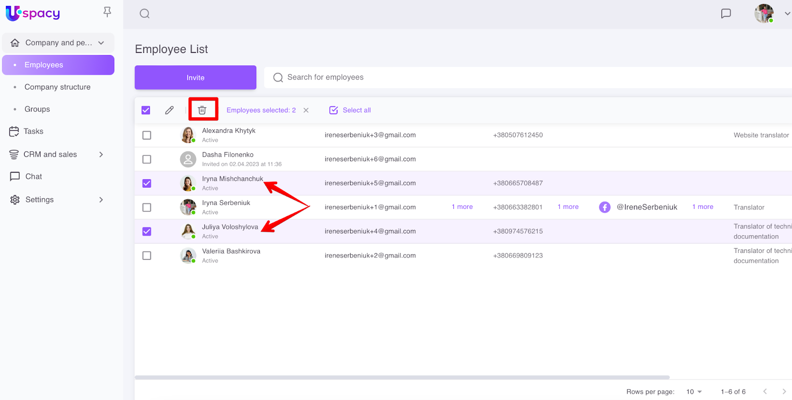 To do this, you need to mark the necessary employees in the list and click on the trash icon.
