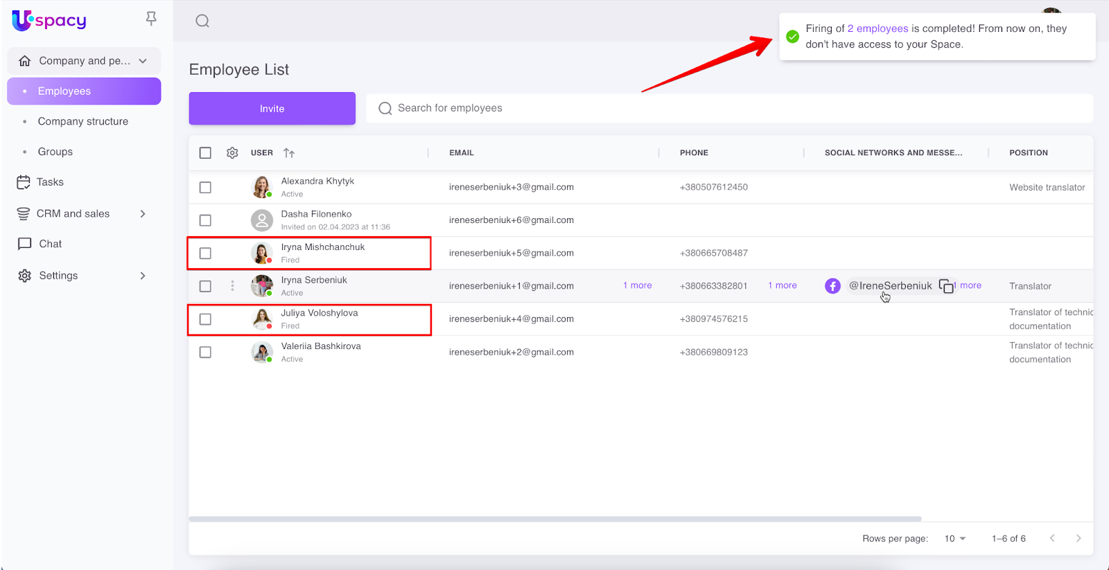 As a result, a message about the success of the actions will be displayed. And employees who have been fired will be displayed in the list with the appropriate status.