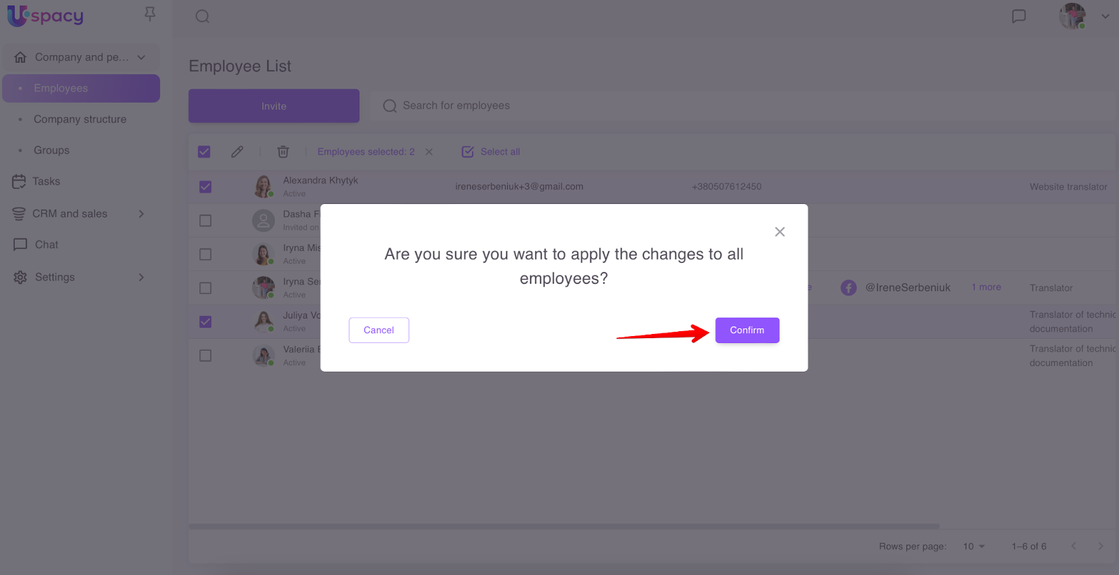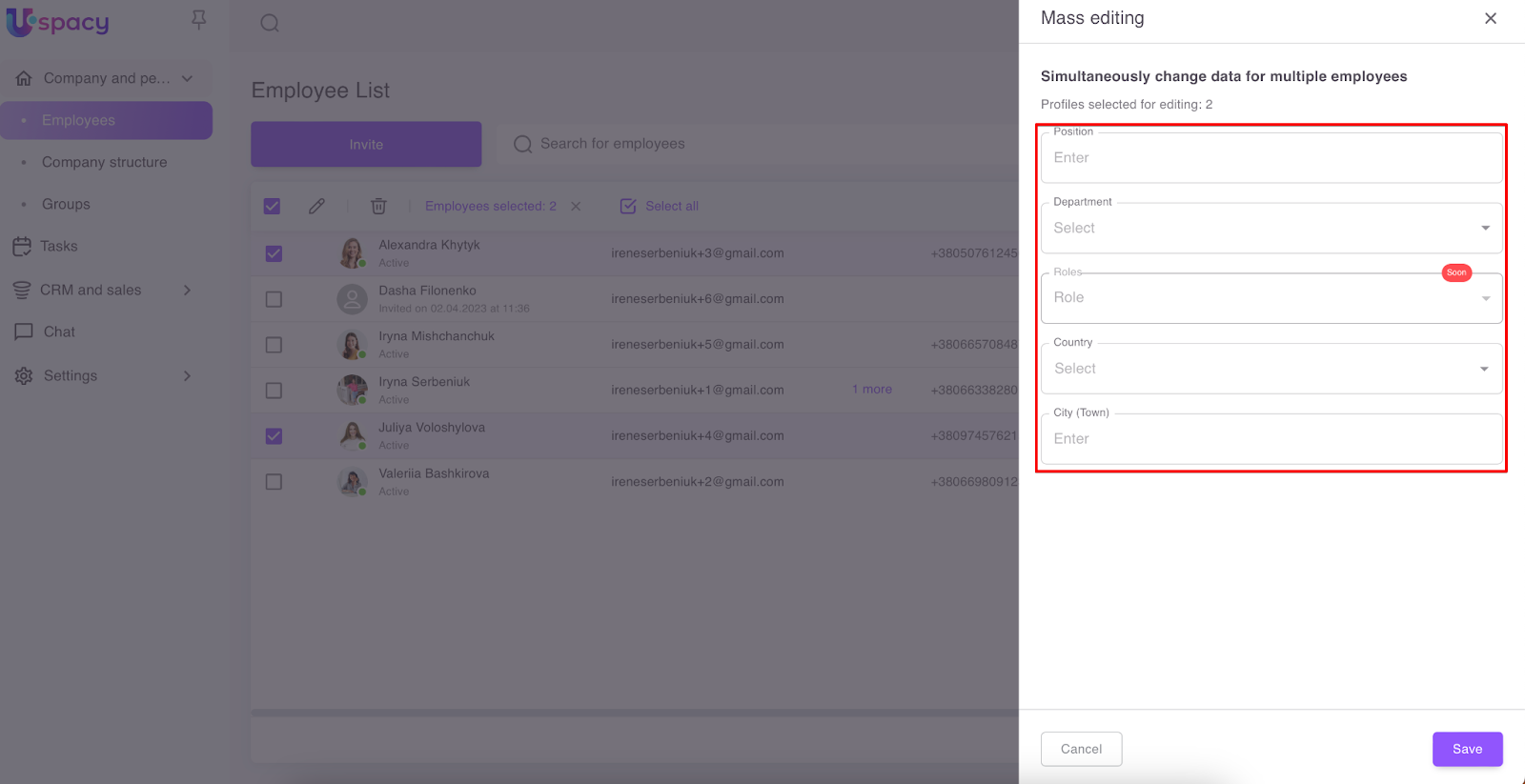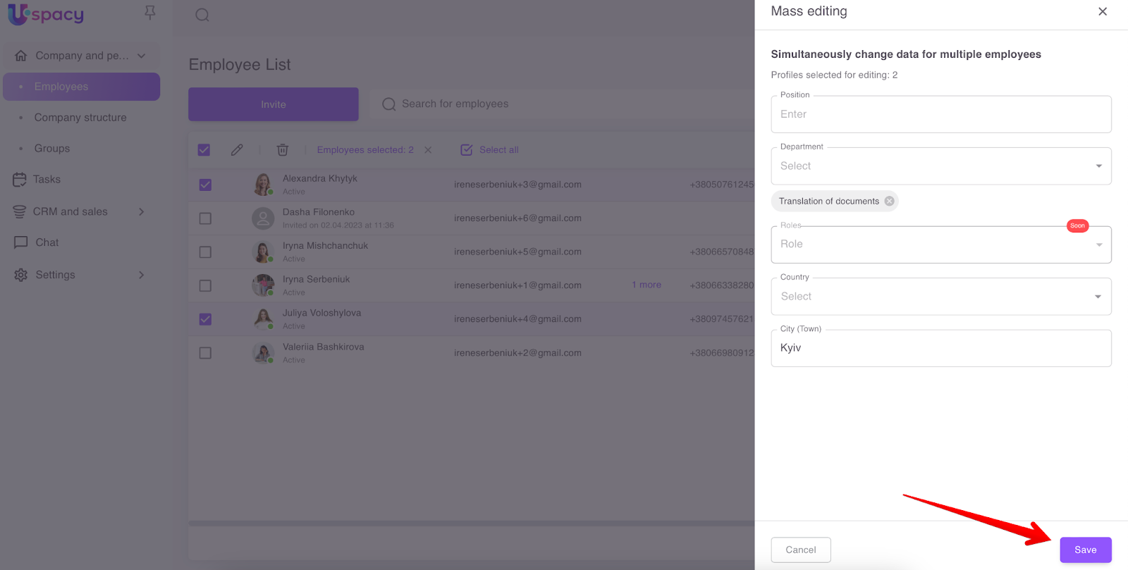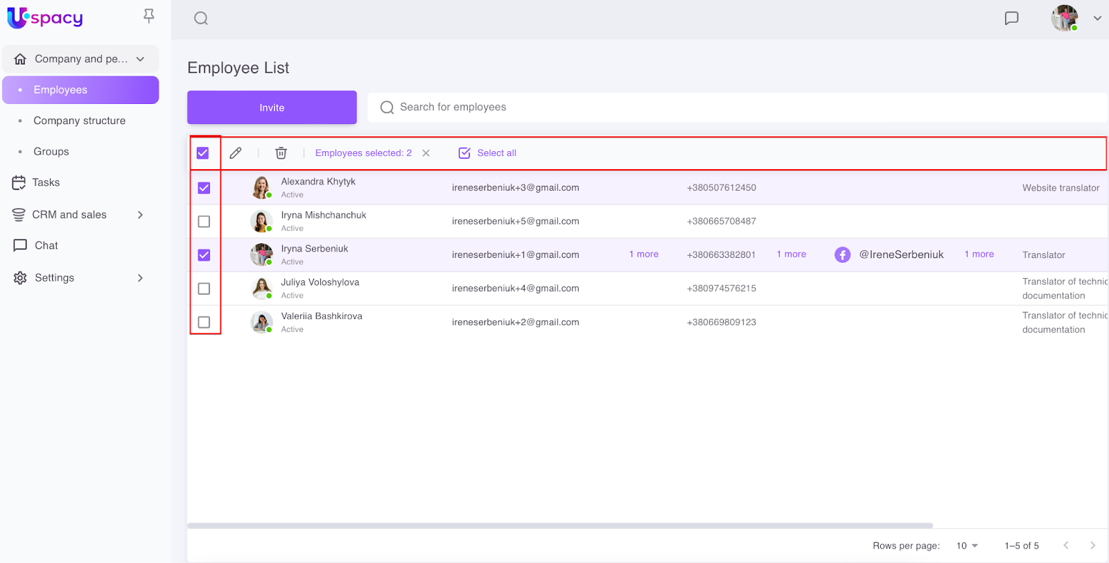 The employee list has special fields, using which you can select several users to edit their profile data at once and make the same changes or apply quick firing.