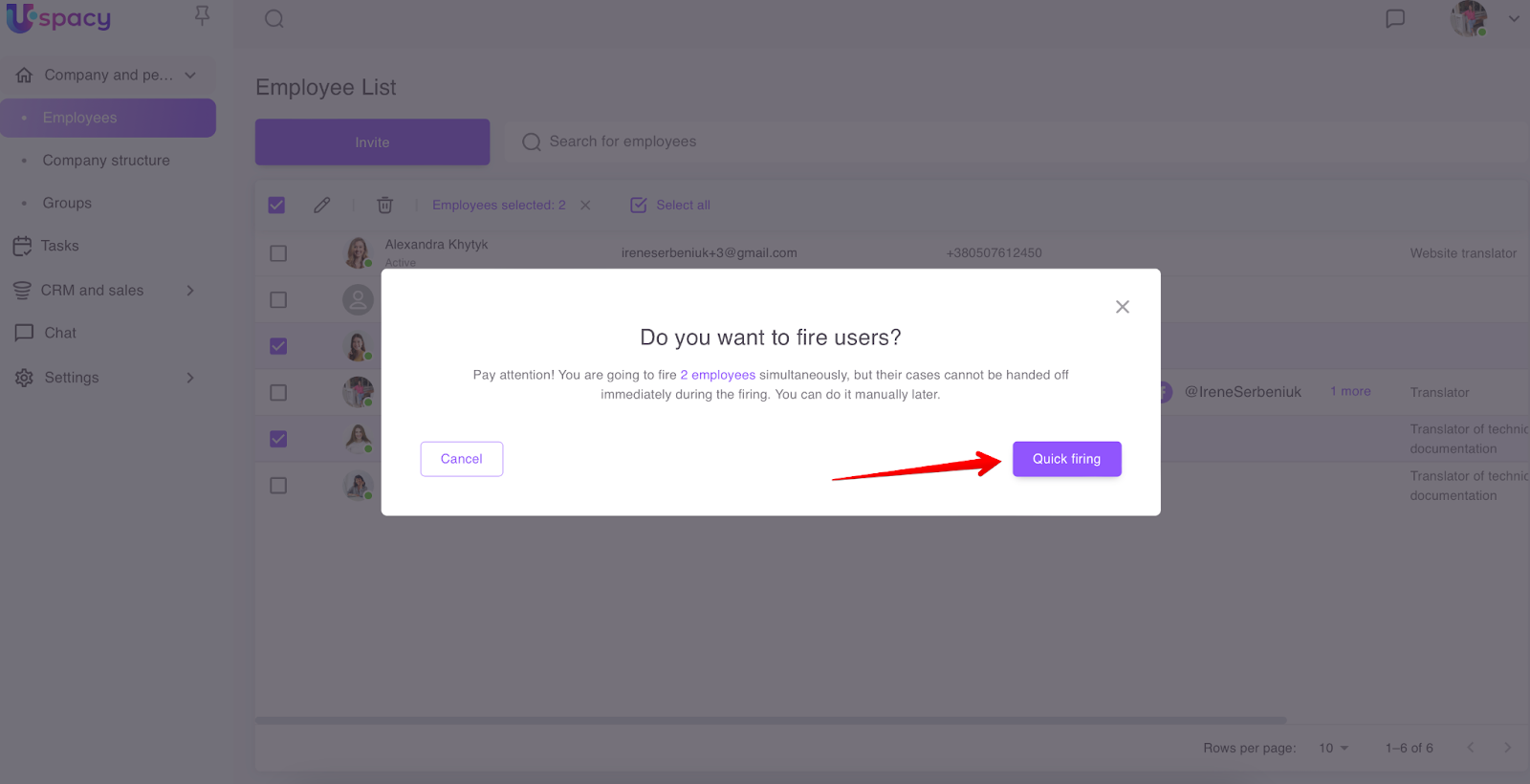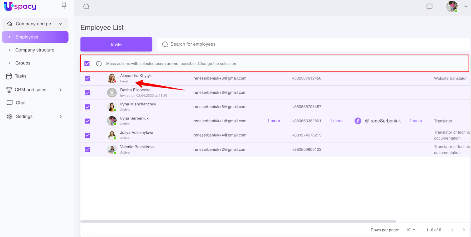 If you mark the current employees of the space in the list, you can proceed to editing information in their profiles and apply quick firing.