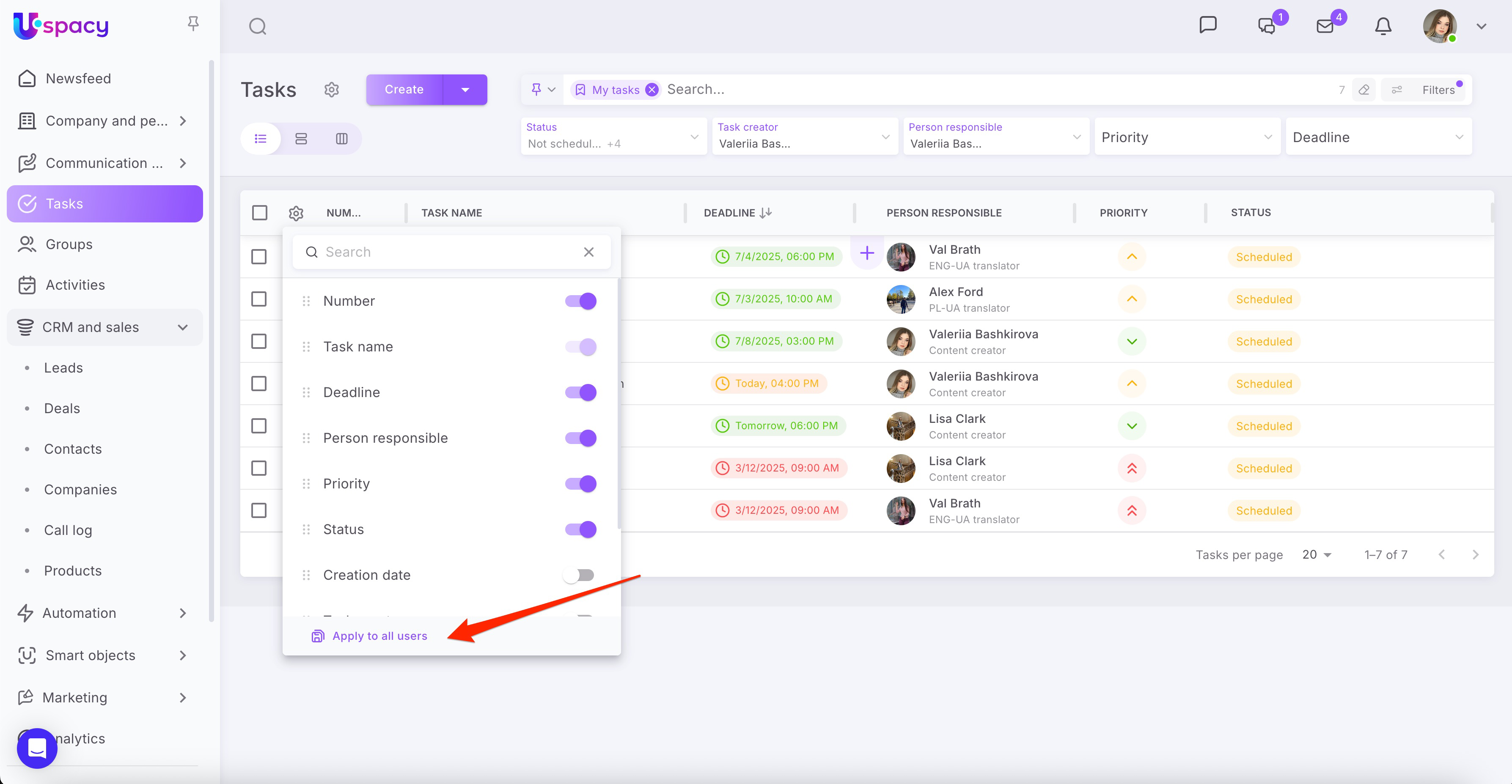 🟣 Saving task table settings for all users at once — a helpful tool for administrators and team leaders. You can now configure the optimal task table layout and apply it to the entire team at once, ensuring a unified approach to task management. Waiting for the same feature in CRM? Stay tuned!