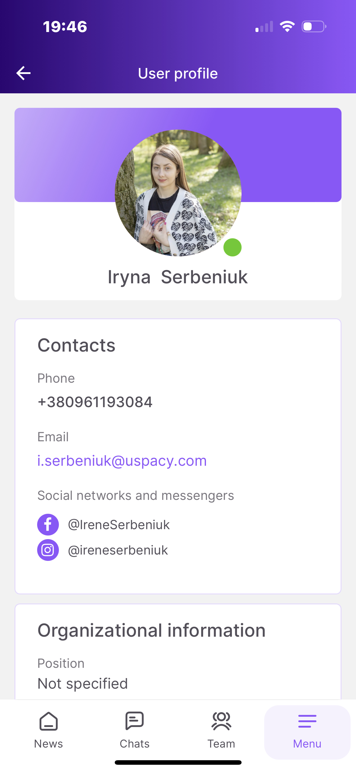 Start by creating a profile and filling it out with information. In such a way your colleagues will learn more about you. The profile contains basic information about the employee and contact details. In addition to the work information, it displays the user's personal information, the date of birth, preferences, interests and a photo.